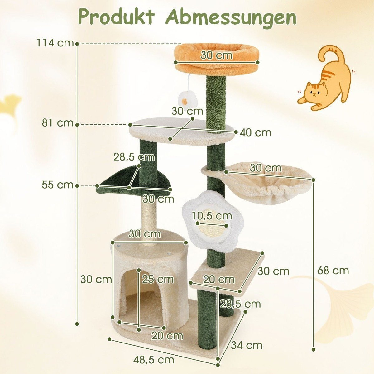 Sukurkite visapusišką pramogų centrą savo pūkuotiems draugams! Su paminkštinta apžvalgos aikštele šis katės namelis suteikia jūsų katei prabangią vietą stebėti savo karalystę. Be to, suktukas ir didelis namelis jūsų katės draugams suteikia puikią poilsio erdvę. Žalia, lapo formos platforma kartu su gėlių formos žaisliuku pagerina estetiką ir suteikia papildomų pramogų.