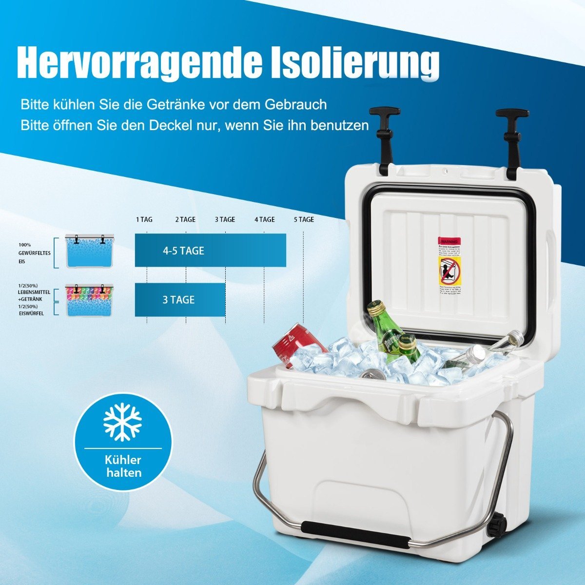 Užtikrinkite, kad jūsų maistas ir gėrimai išliktų švieži visų lauko pramogų metu su šia aukščiausios kokybės nešiojama aušinimo dėže. Dėl patvarios konstrukcijos ir ilgo šilumos išlaikymo laiko ji idealiai tinka bet kokiai kelionei ar renginiui.