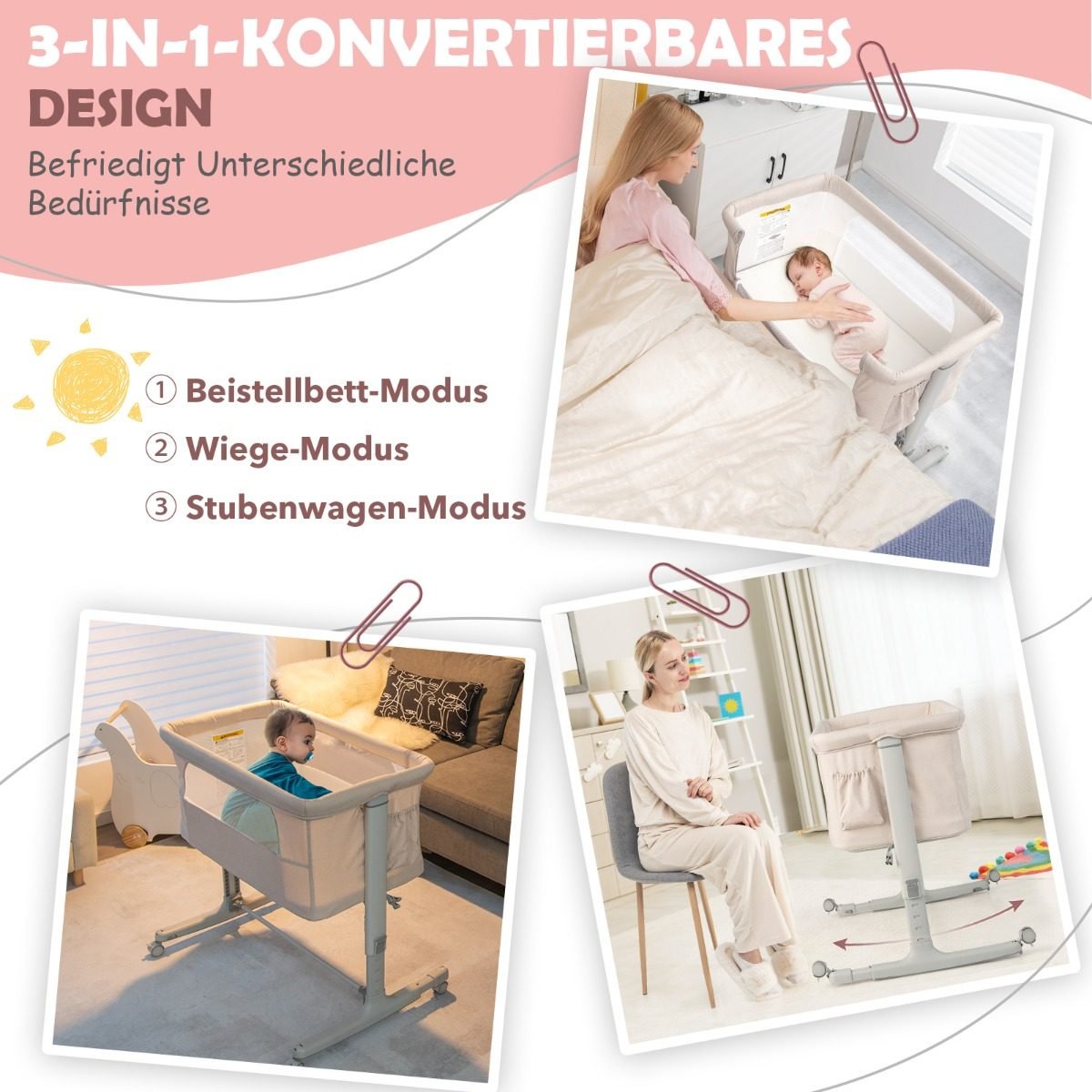 • Universali 3-in-1 funkcija: veikia kaip lopšys, prisidedanti lovytė ar vežimėlis.