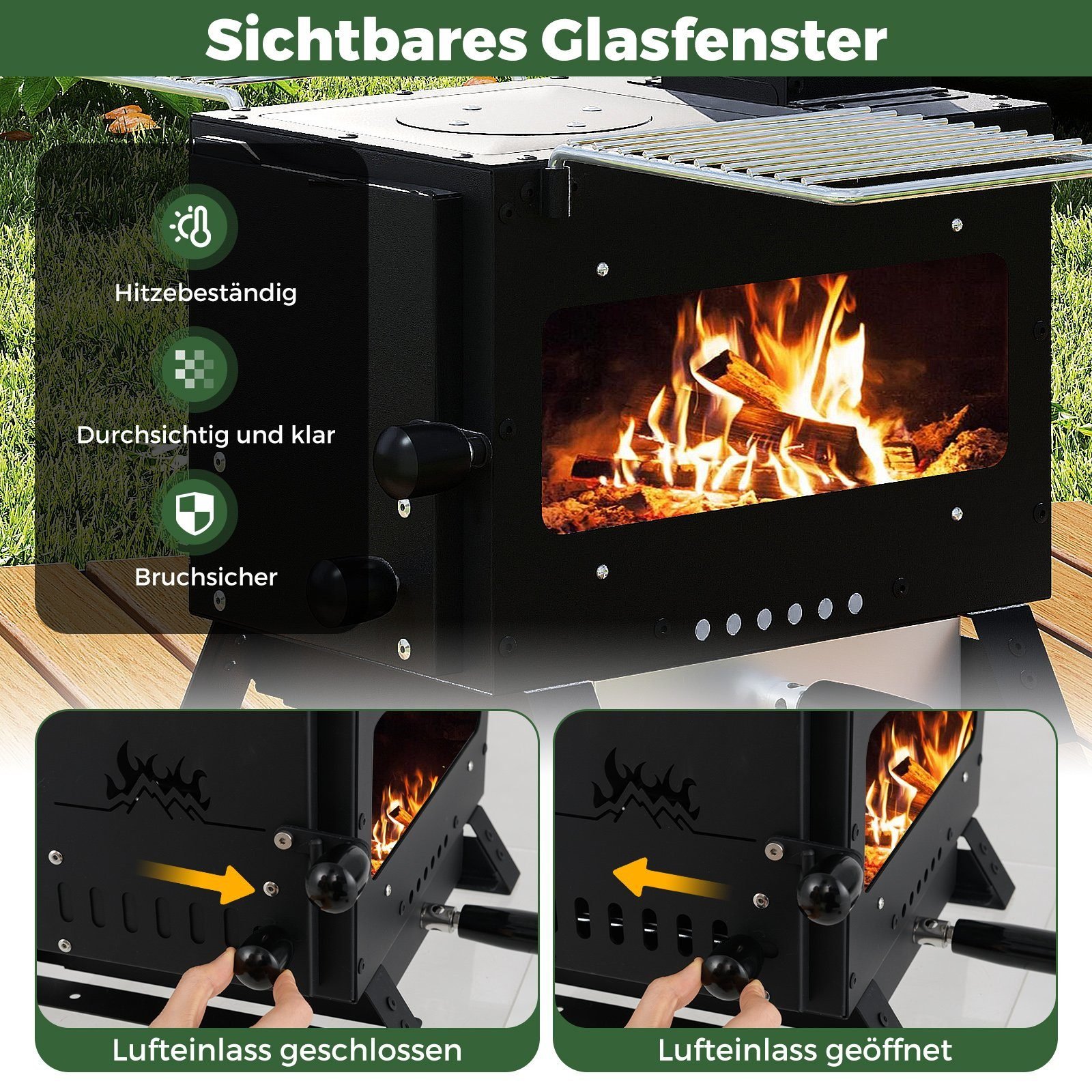 Nešiojama lauko krosnelė su virykle ir grotelėmis (Juoda)