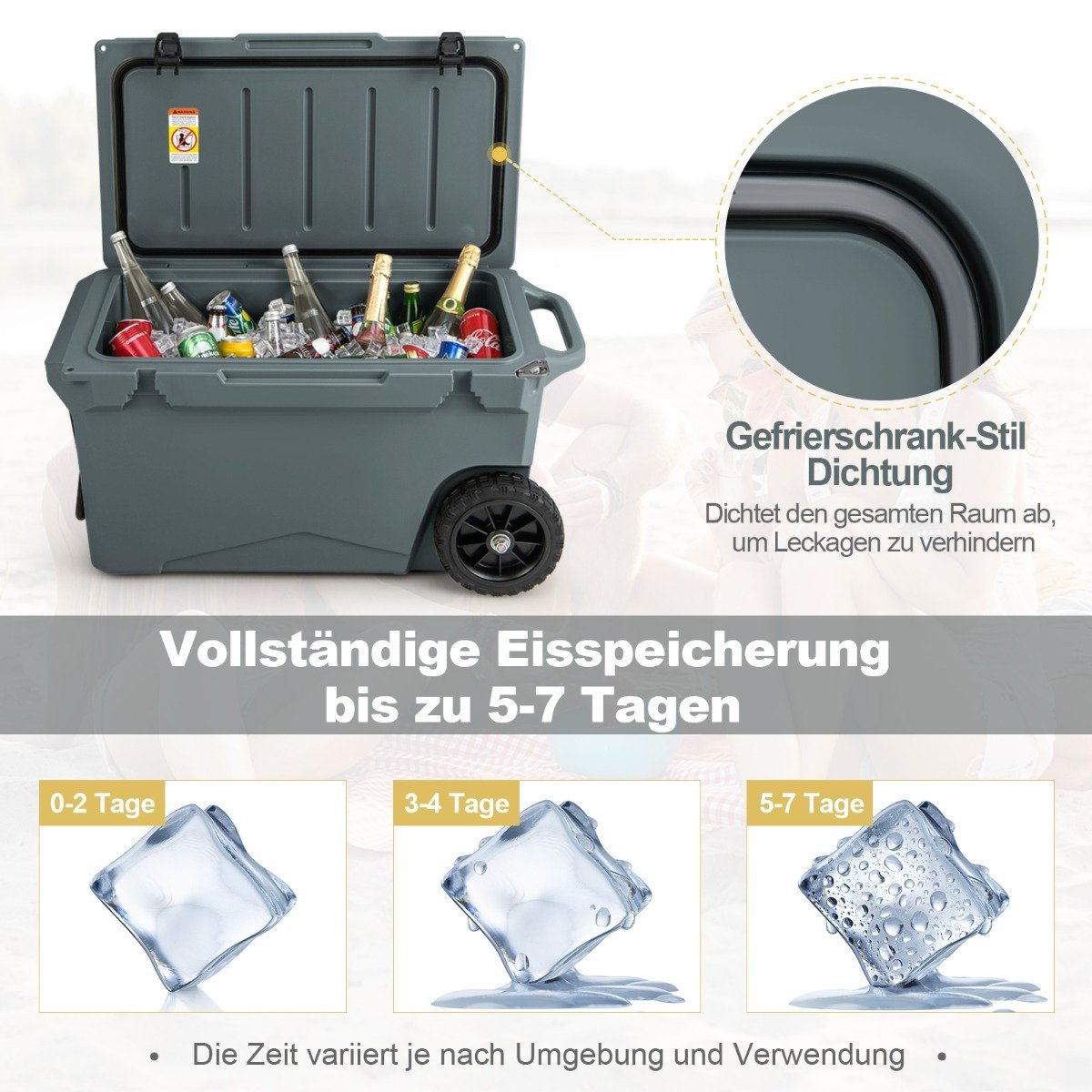 Nešiojamas izoliuotas šaltkrepšis su ratukais ir dangtelių atidarytuvu (Pilka)