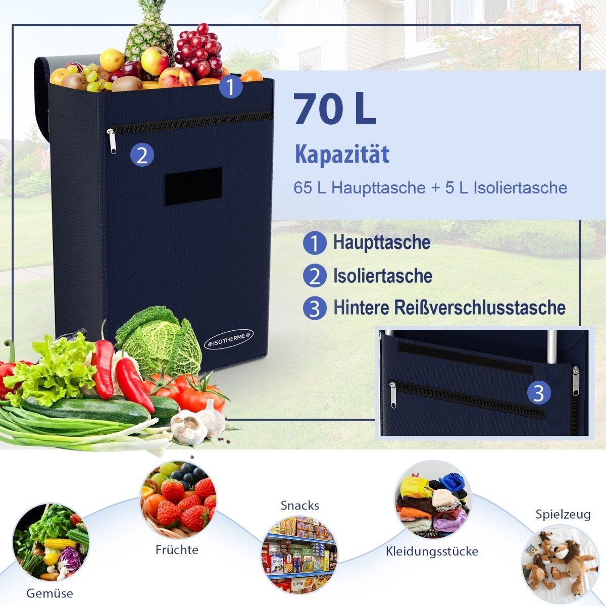 - Daug vietos daiktams: pagrindinis skyrius (65 L), atskiras 5 L talpos izoliuotas skyrius ir galinė kišenė su užtrauktuku.