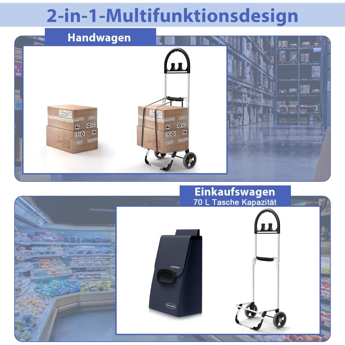 - Universalus 2-in-1 dizainas: gali būti naudojamas kaip pirkinių vežimėlis arba kaip rankinis vežimėlis.