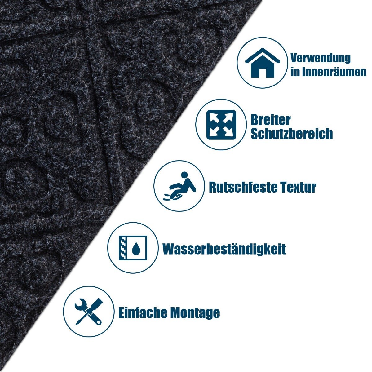 - Daugiasluoksnė, neslystanti tekstūra užtikrina aukštą naudojimo komfortą. Kilimus sudaro keturi sluoksniai: vandeniui atsparus poliesteris, amortizuojantis sluoksnis, neslystantis PVC pagrindas ir apsauginė plėvelė. Tai efektyviai apsaugo nuo paslydimo ir laiptų subraižymo.