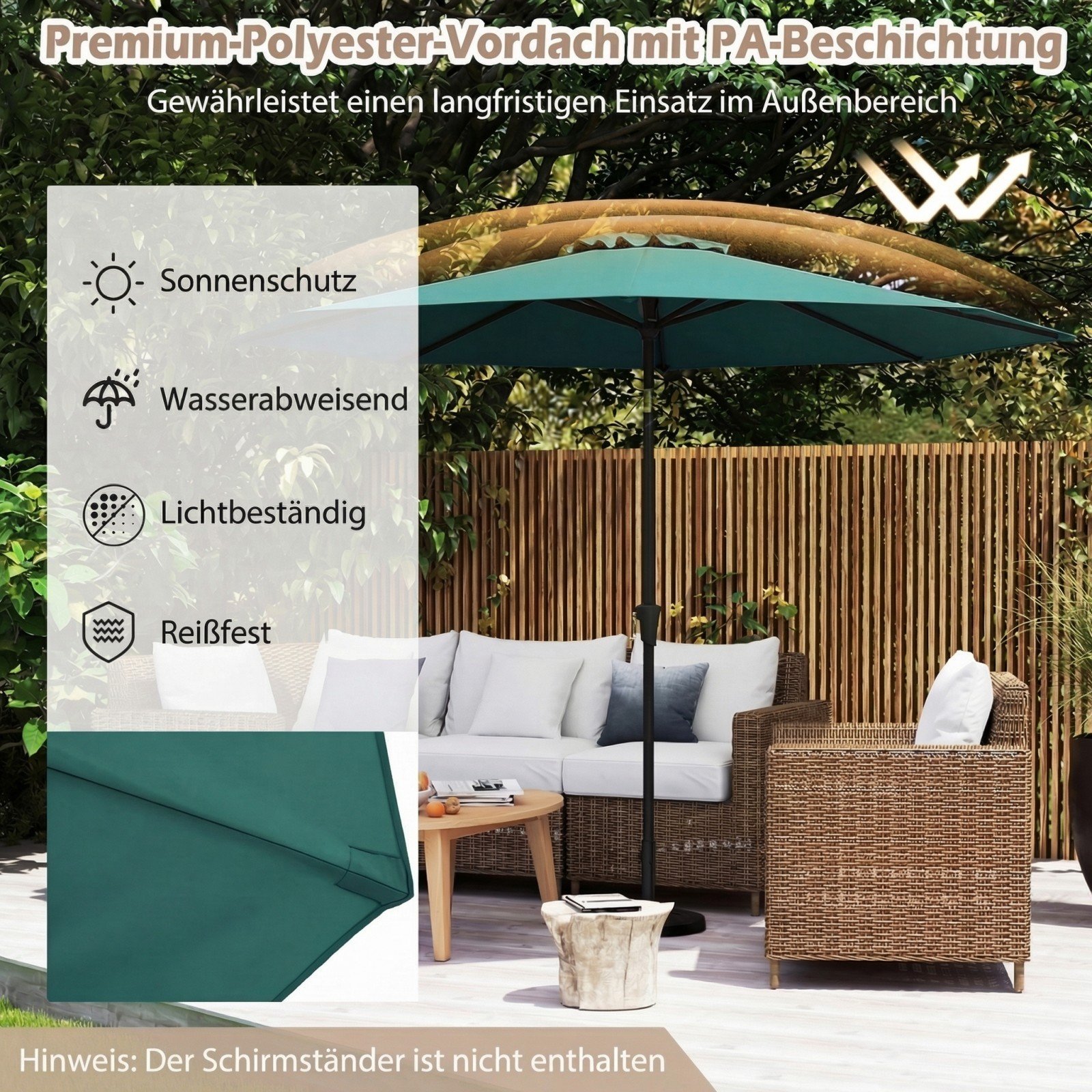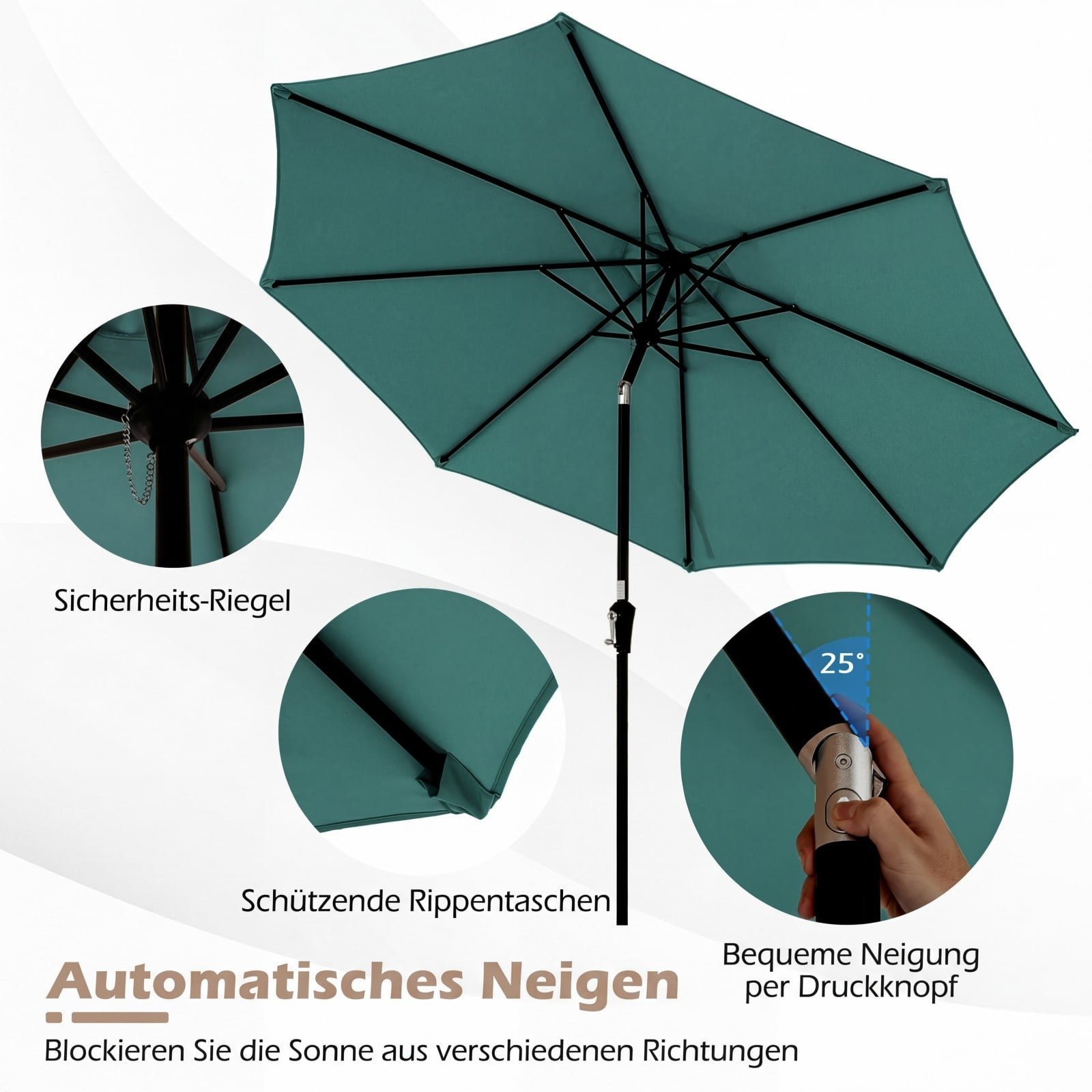 • Reguliuojamas pakreipimas: Inovatyvus automatinis pakreipimo mechanizmas leidžia lengvai reguliuoti skėčio kampą iki 25° į abi puses, garantuojant optimalų pavėsį visą dieną.