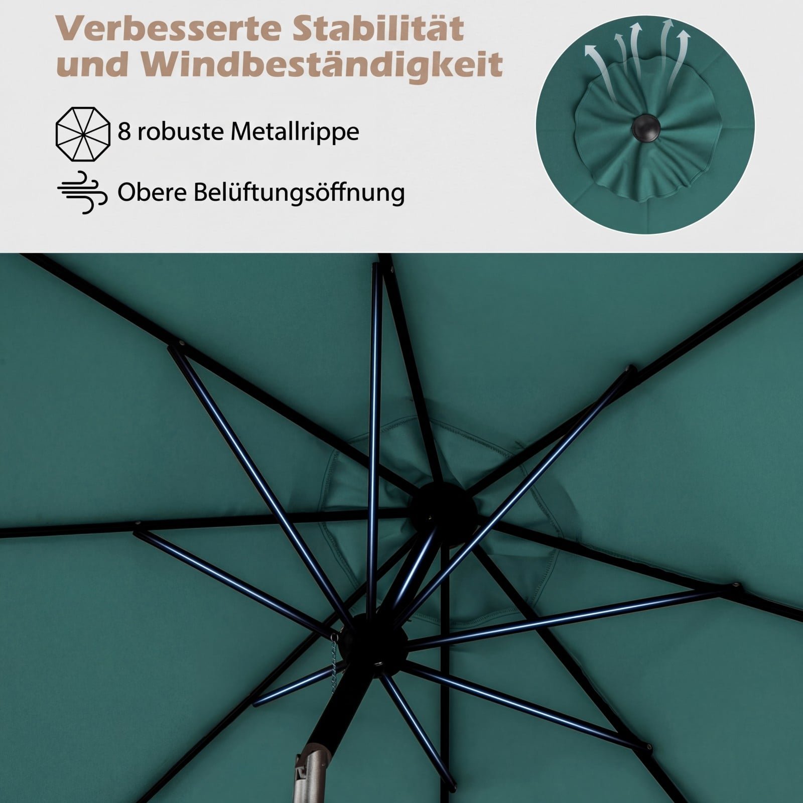 • Tvirta ir stabili konstrukcija: 8 tvirti metaliniai strypai ir viršutinė ventiliacijos anga, kuri efektyviai mažina vėjo slėgį bei skatina oro cirkuliaciją, užtikrina išskirtinį ilgaamžiškumą ir puikų atsparumą vėjui.