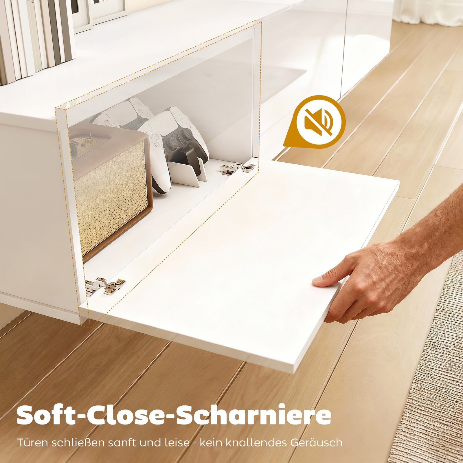 Perkrauta svetainė gali trikdyti poilsį. Ši TV spintelė sukuria atvirą, tvarkingą erdvę, atlaisvindama grindis ir viską tvarkingai paslėpdama. Trys atverčiami TV staliuko skyriai paslepia nuotolinio valdymo pultelius ir konsoles, o 180 cm pločio paviršius talpina televizorius iki 82 colių. Su švelniai užsidarančiais vyriais ir blizgiomis baltomis durelėmis, ji užtikrina tylią eleganciją ir modernų ryškumą kasdieniame gyvenime.