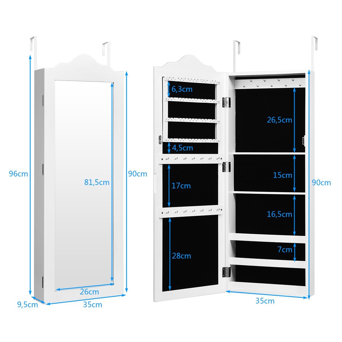Atraskite stilingą ir praktišką sprendimą vertingiems papuošalams laikyti su šia pakabinama papuošalų spintele. Šis baldas ne tik padeda tvarkingai sutvarkyti jūsų papuošalus, bet ir tarnauja kaip elegantiškas, viso ilgio veidrodis, tobulai papildantis bet kurio miegamojo interjerą.