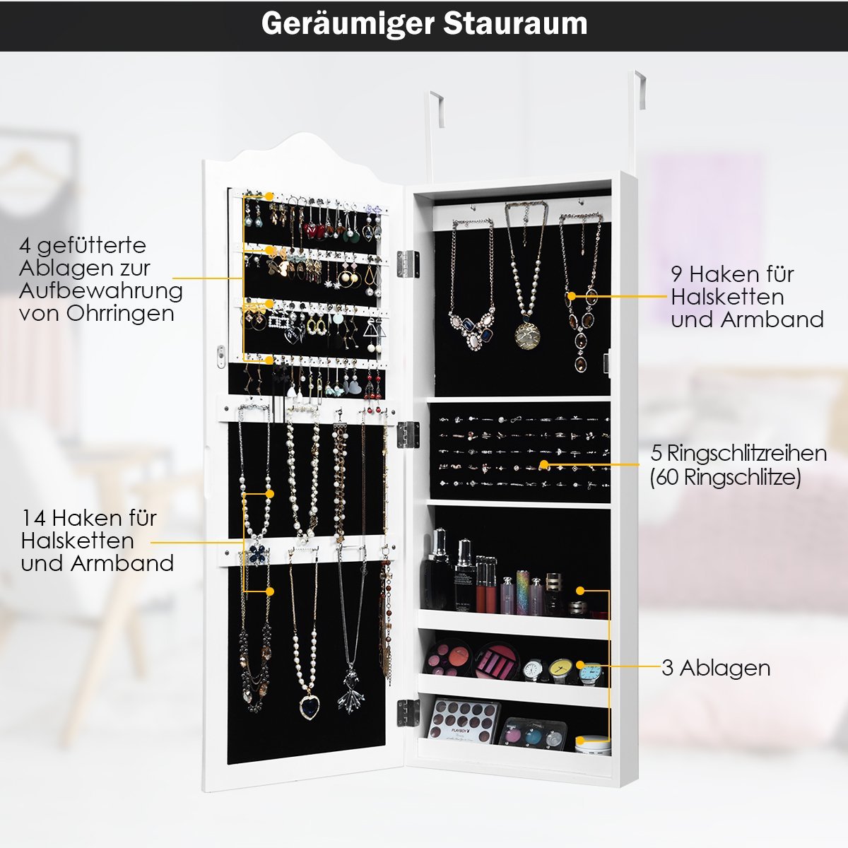 - Erdvi laikymo talpa: keturios lentynos auskarams, 23 kabliukai karoliams ir apyrankėms, 72 vietos žiedams ir 3 papildomos lentynėlės.