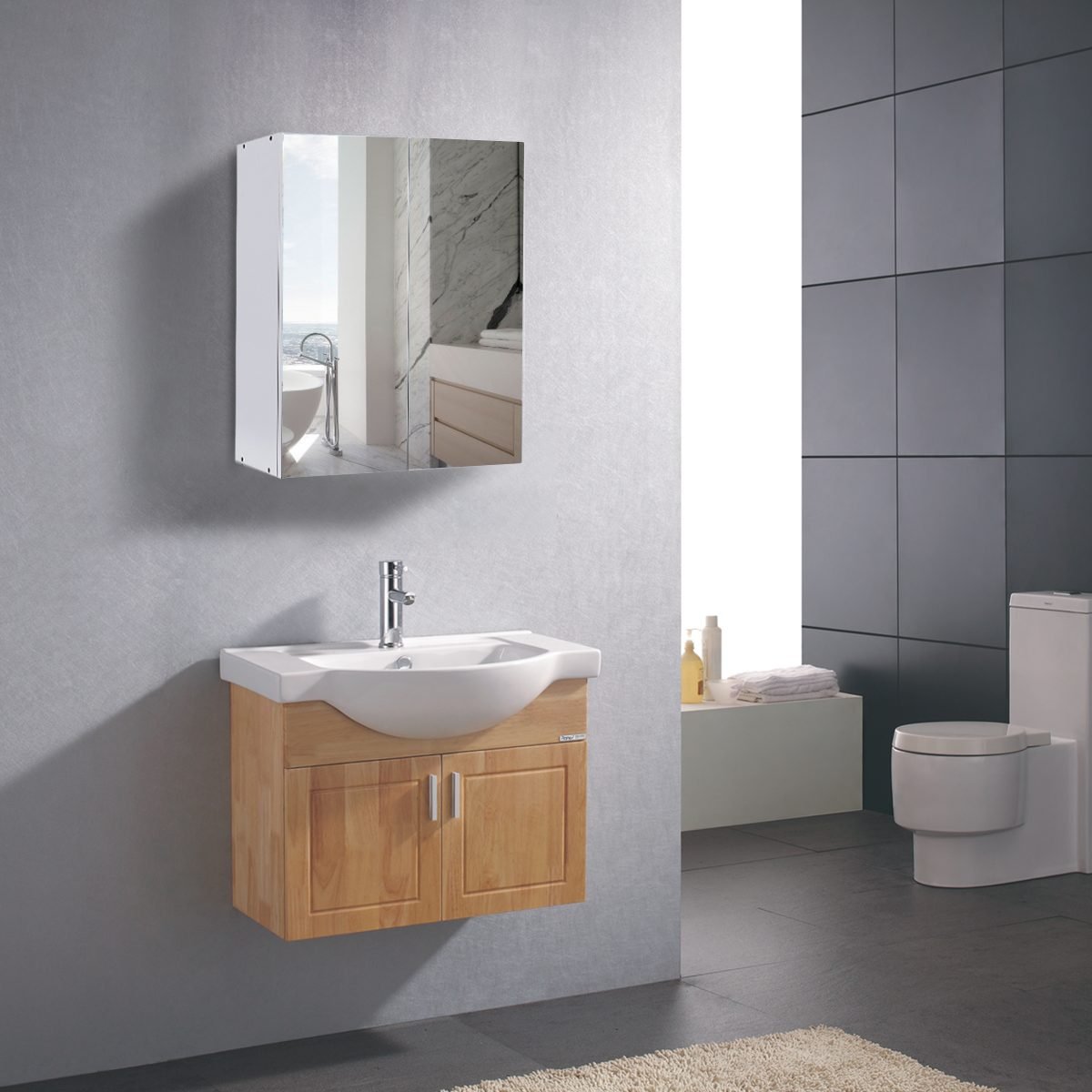 - Erdvūs skyriai už veidrodinių durelių, skirti higienos priemonėms ir kitiems vonios reikmenims tvarkingai laikyti.