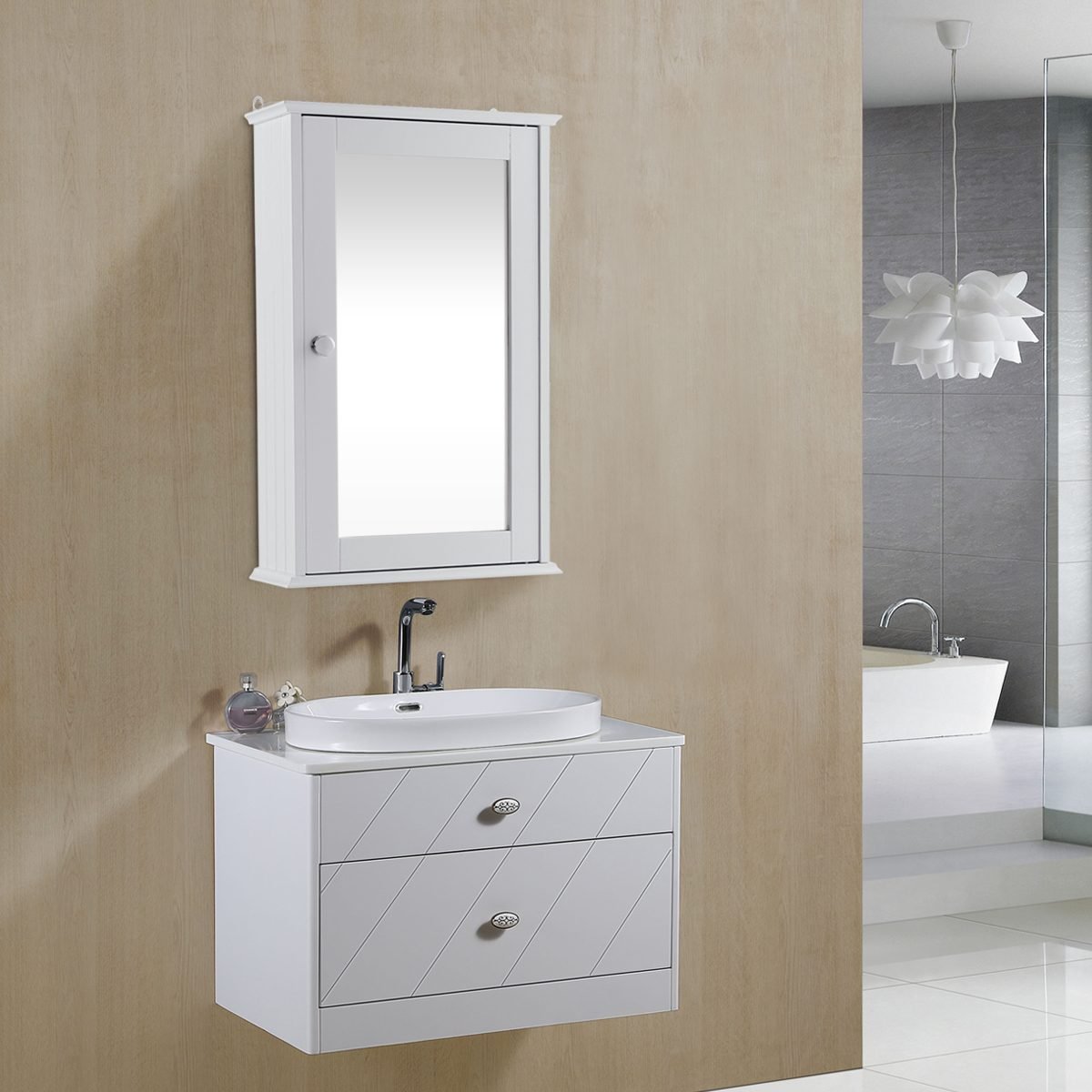 - Du skyriai už veidrodinių durelių suteikia pakankamai vietos vonios reikmenims.