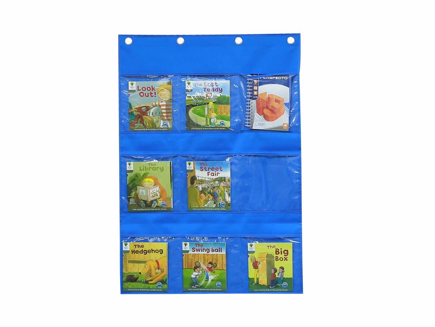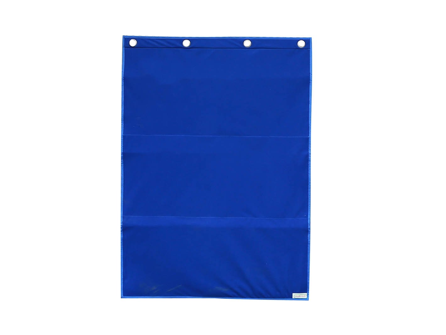 Pakabinamas medžiaginis laikiklis knygoms ir paveikslėliams su kišenėlėmis, mėlynas