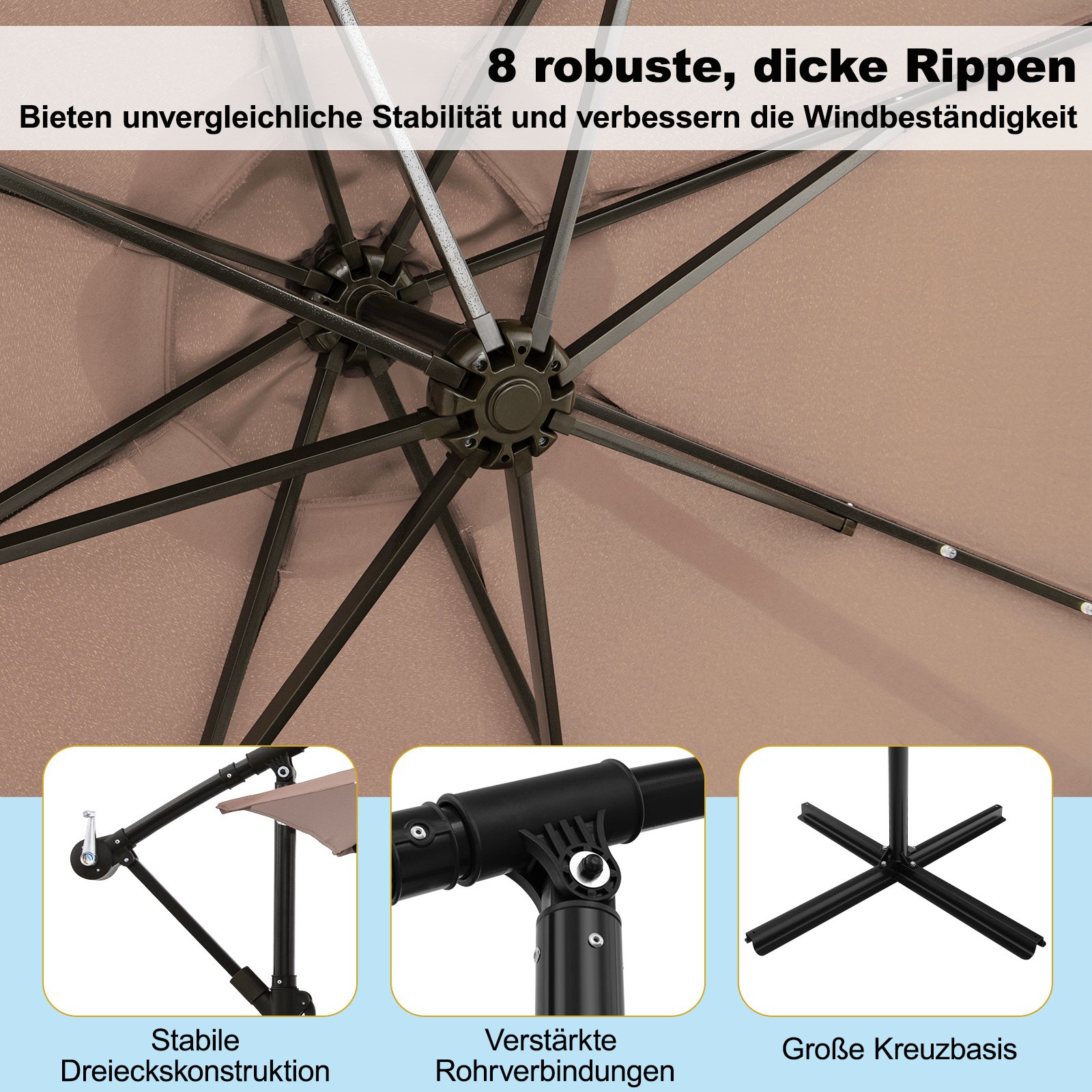 Pakabinamas sodo skėtis su LED apšvietimu ir reguliuojamu pasvirimu (Šviesiai ruda)