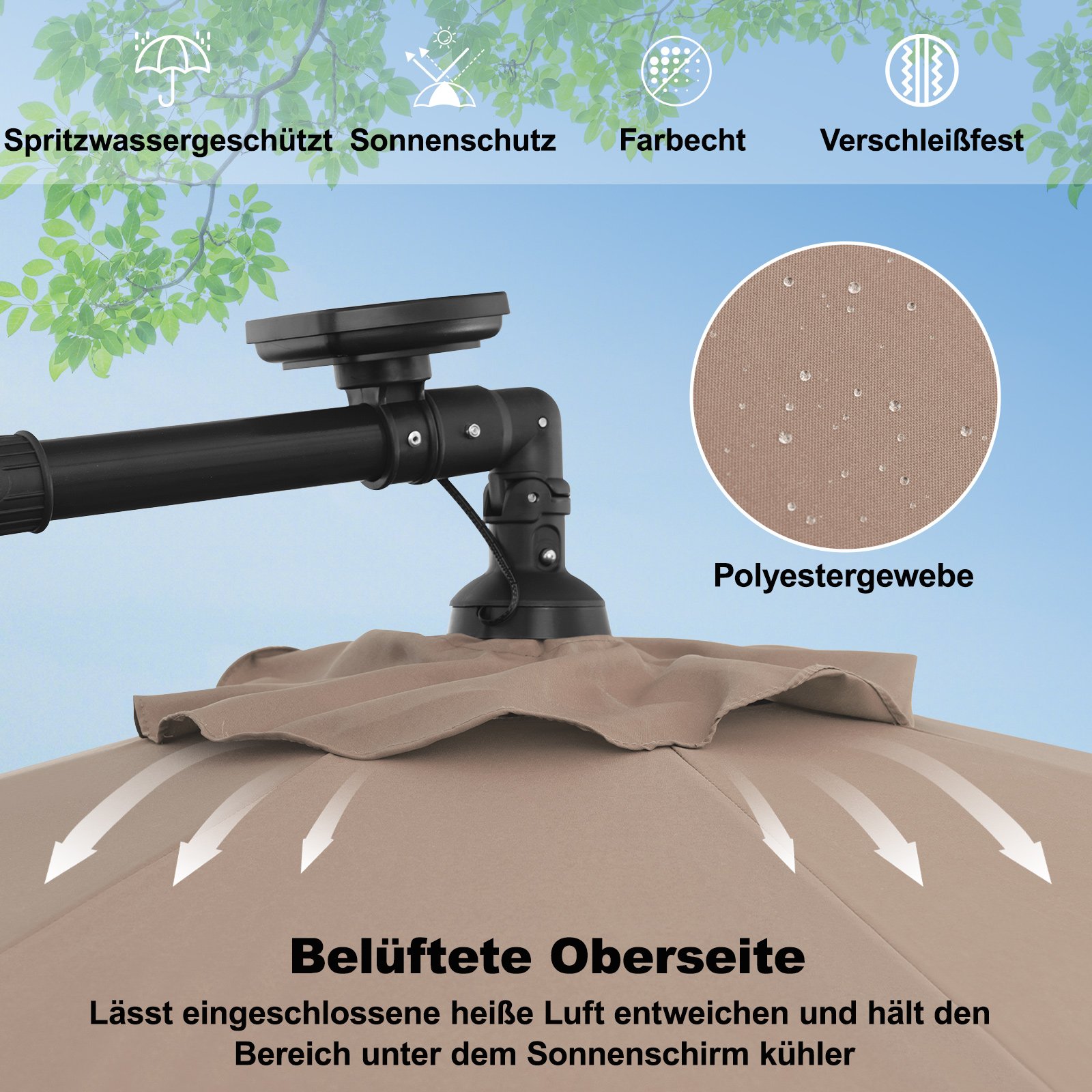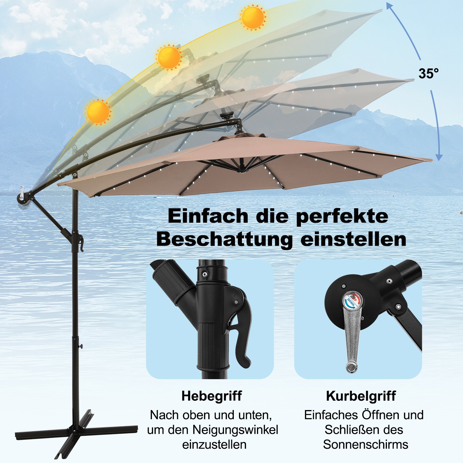 Sukurkite patogią ir šešėlingą oazę savo lauko erdvėje ir mėgaukitės gamta stilingai! Mūsų saulės energija maitinamas pakabinamas skėtis suteikia erdvią 7 m² šešėlio erdvę, užtikrindamas patikimą apsaugą nuo saulės. Su 40 LED lempučių ir energiją taupančiu saulės kolektoriumi, šis skėtis sukurs jaukią atmosferą ir leis jums mėgautis maloniais vakarais po atviru dangumi. Reguliuojamas pasvirimo kampas leidžia lengvai keisti pavėsio kryptį ir mėgautis vėsiu pavėsiu visą dieną.