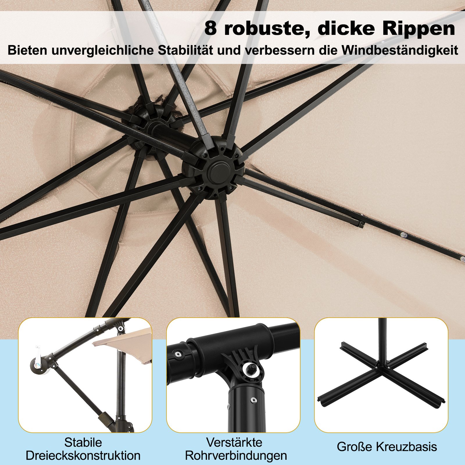 - Tvirta ir stabili konstrukcija: 8 metalinės atramos ir tvirtas metalinis stulpas su milteliniu būdu dengtu paviršiumi užtikrina stabilumą net vėjuotomis dienomis.