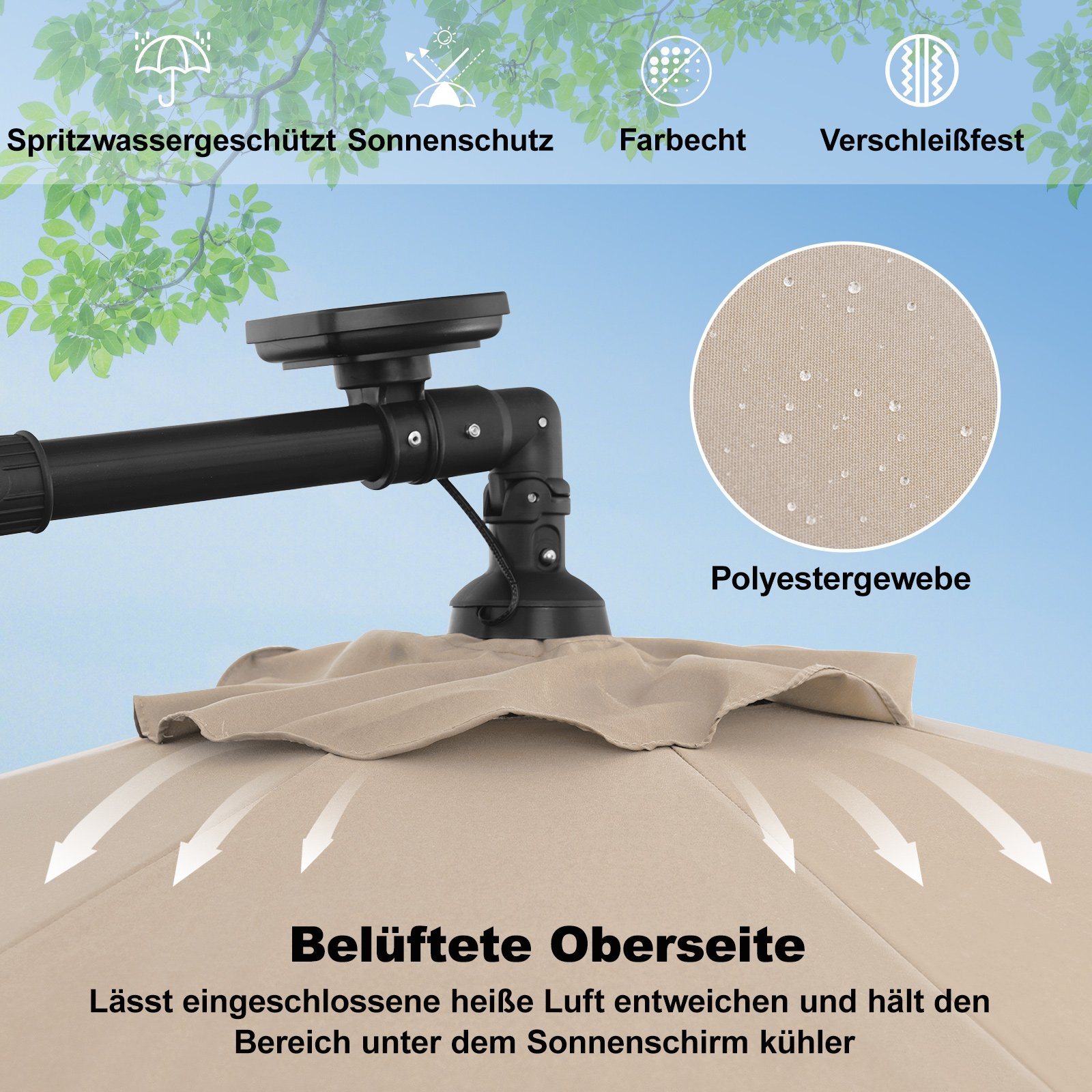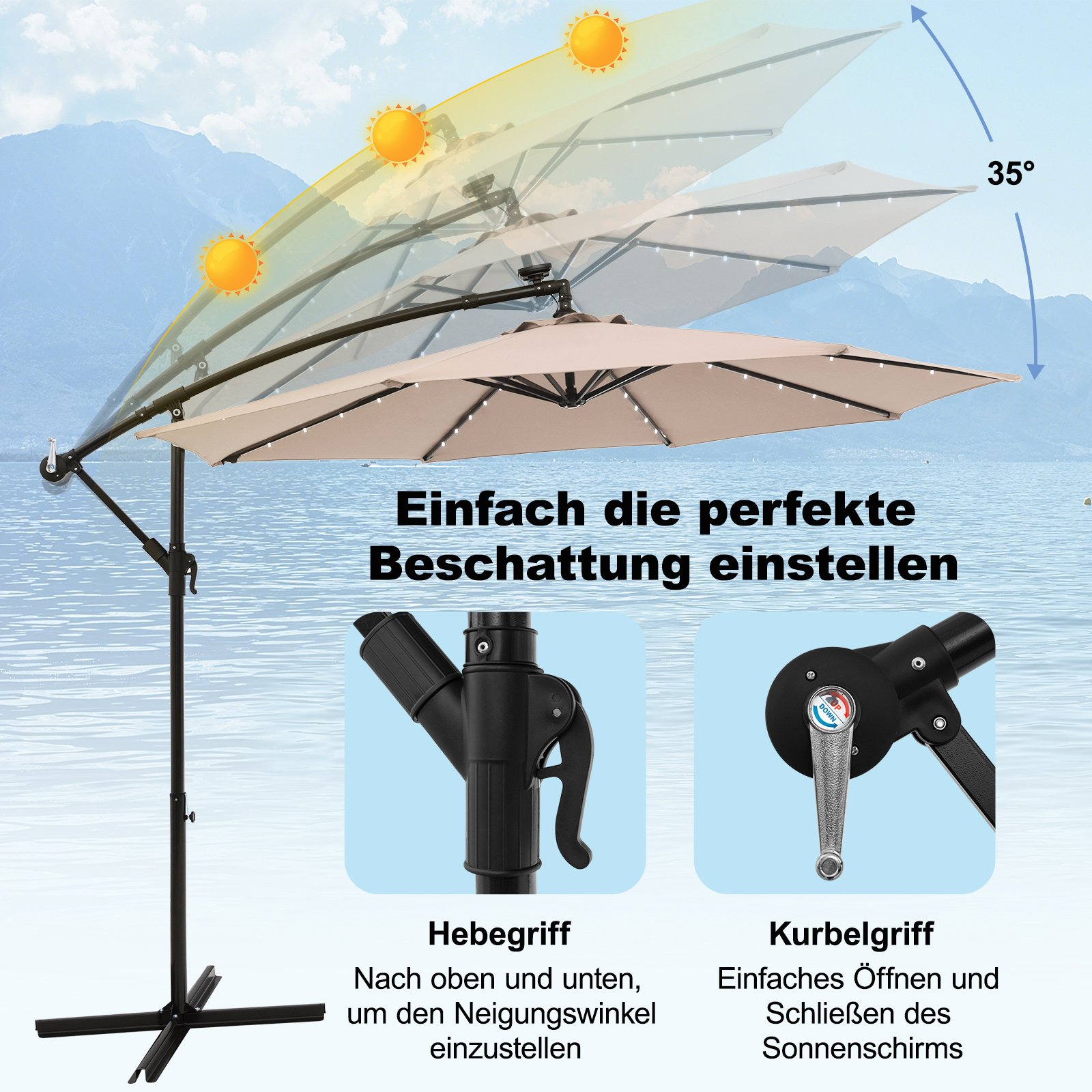 - Didelė pavėsio zona ir reguliuojamas pasvirimas: Skėtis suteikia 7 m² apsaugą nuo saulės ir leidžia reguliuoti pasvirimo kampą nuo 0 iki 35° pagal saulės padėtį.