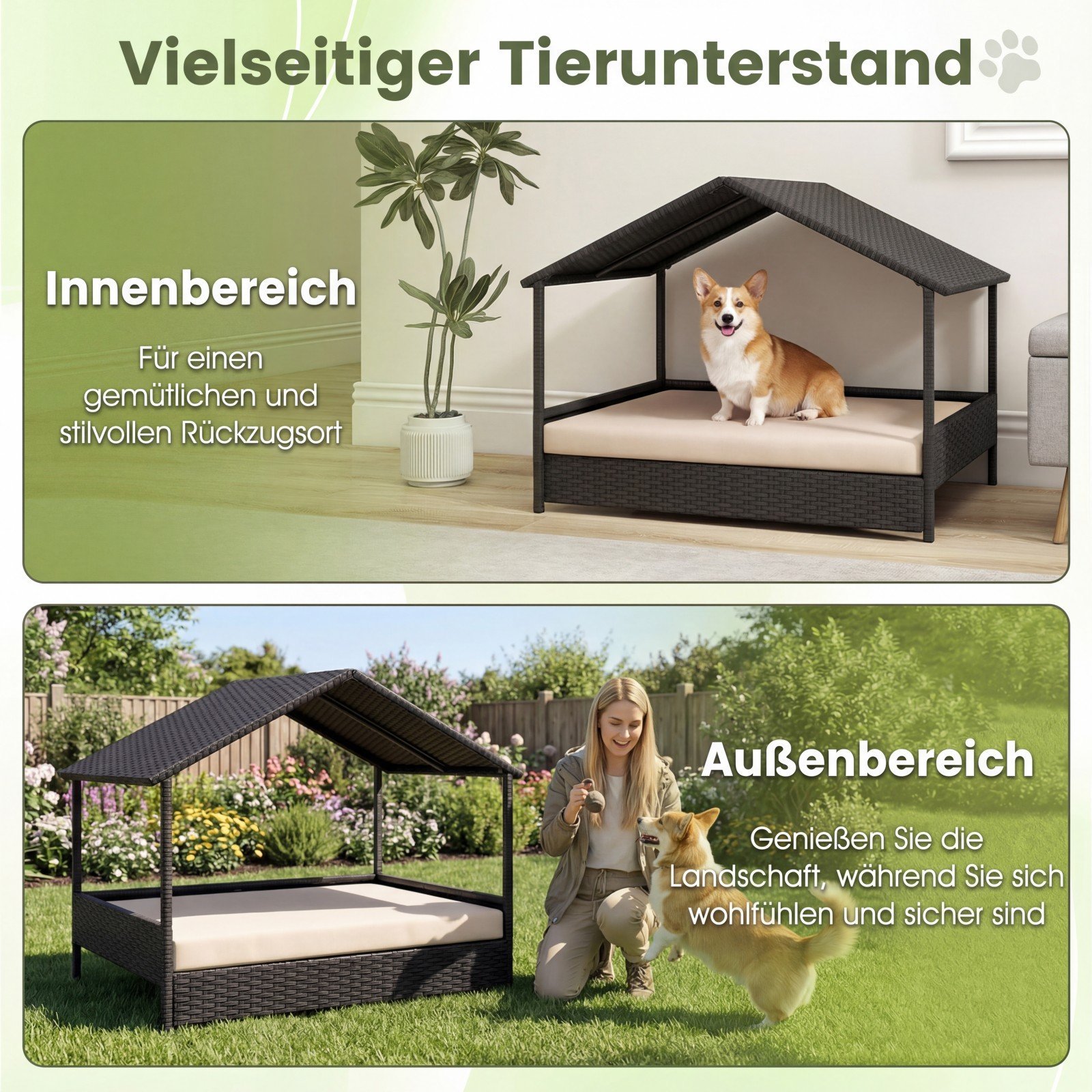 Paverskite savo augintinio poilsio zoną stilinga ir funkcionalia vieta su šia elegantiška rotango šunų būda. Idealiai tinka jaukiam poilsiui namuose ar malonioms akimirkoms lauke, užtikrinant komfortą ir apsaugą. Rankomis pintas PE rotangas ir tvirtas cinkuoto metalo rėmas garantuoja atsparumą vandeniui, blukimui ir stabilumą bet kokiomis oro sąlygomis. Pakeltas dizainas pagerina oro cirkuliaciją ir užtikrina sausumą, taip prisidėdamas prie augintinio sveikatos.