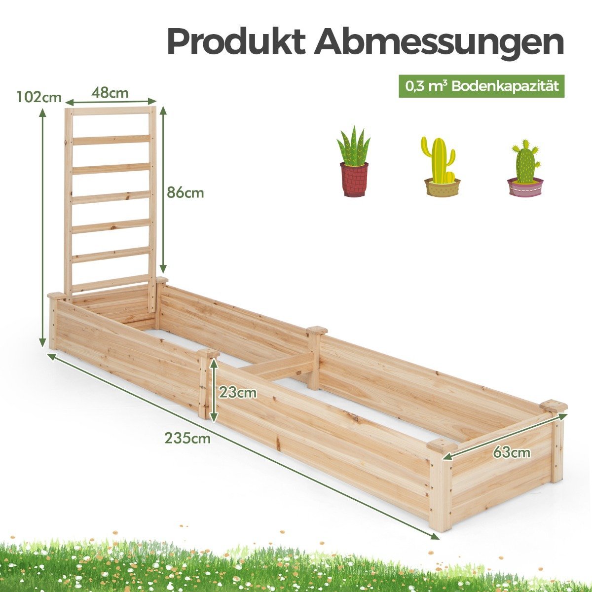 Sukurkite savo svajonių sodą su šiuo universaliu ir praktišku pakeltu daržo lysvės sprendimu. Patogus 235 x 63 x 102 cm dydis suteikia daug erdvės įvairiems augalams, žolėms ar daržovėms. Integruota atrama leis kylančioms gėlėms ar dekoracijoms suteikti sodui elegancijos. Jo atviras dugnas užtikrina optimalų drenažą ir oro cirkuliaciją, skatinant sveiką augalų augimą.