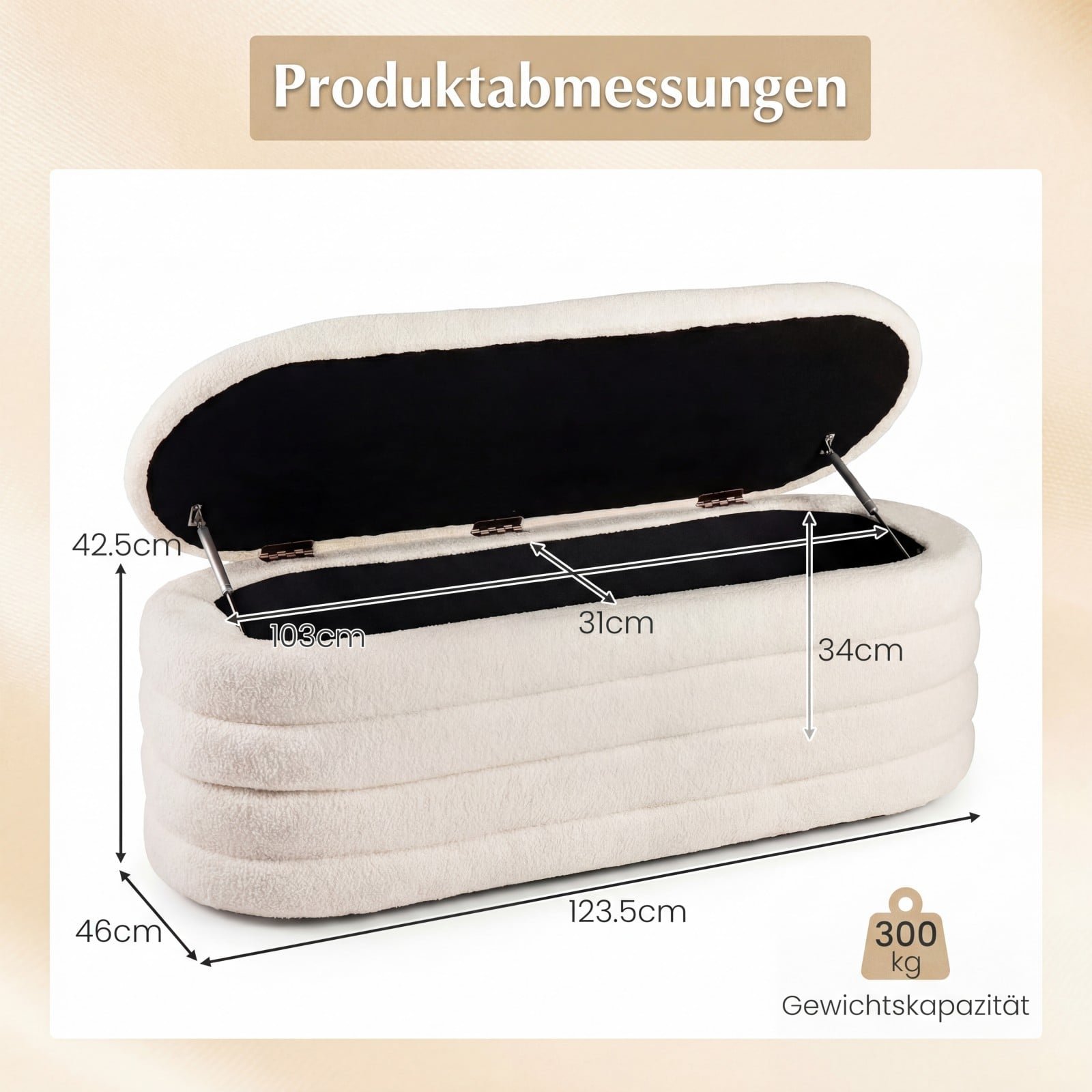 Šis daugiafunkcis suoliukas su daiktadėže puikiai derina stilių ir praktiškumą. Talpus 108,5 l skyrius ir patogus bouclé audinio apmušalas paverčia jį puikiu priedu jūsų namams. Dėl sklandaus dangčio atidarymo mechanizmo ir tvirtos konstrukcijos, atlaikančios iki 300 kg apkrovą, šis suoliukas užtikrins patogumą ir tvarką bet kurioje patalpoje.