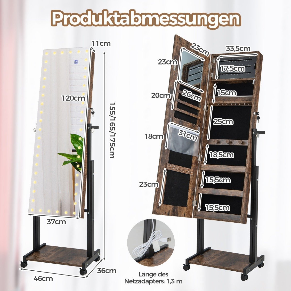 Papuošalų spintelė su veidrodžiu LED apšvietimu ant ratukų (Ruda)