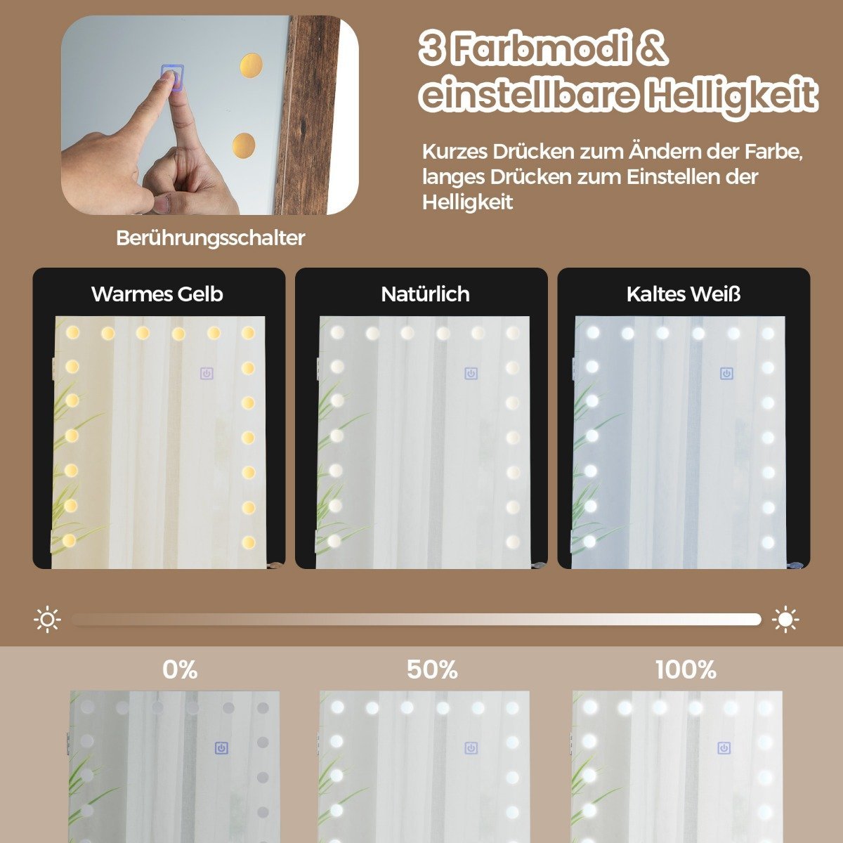 - Reguliuojamas LED apšvietimas su 3 spalvų režimais (šilta geltona, natūrali balta, šalta balta) ir ryškumo reguliavimo funkcija.