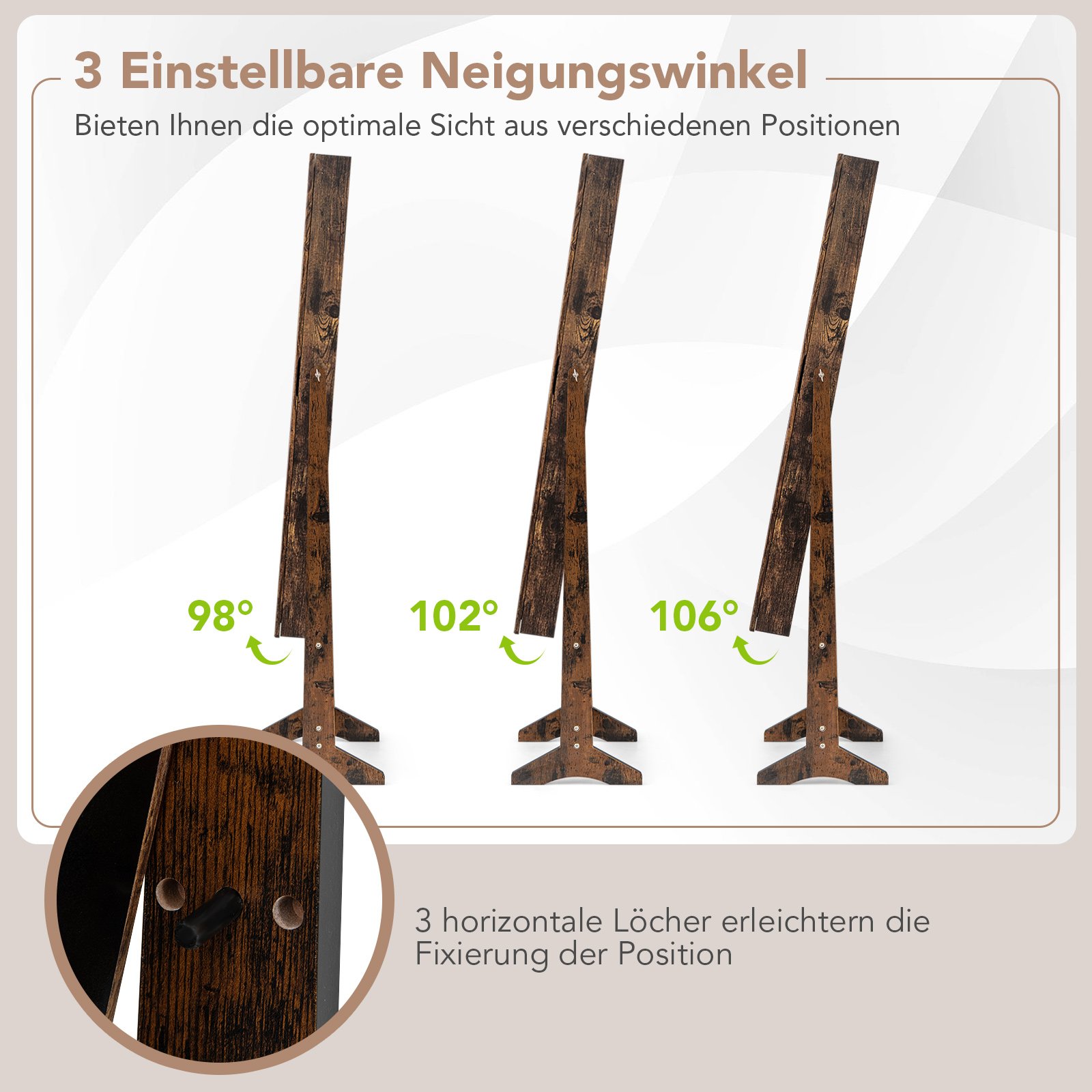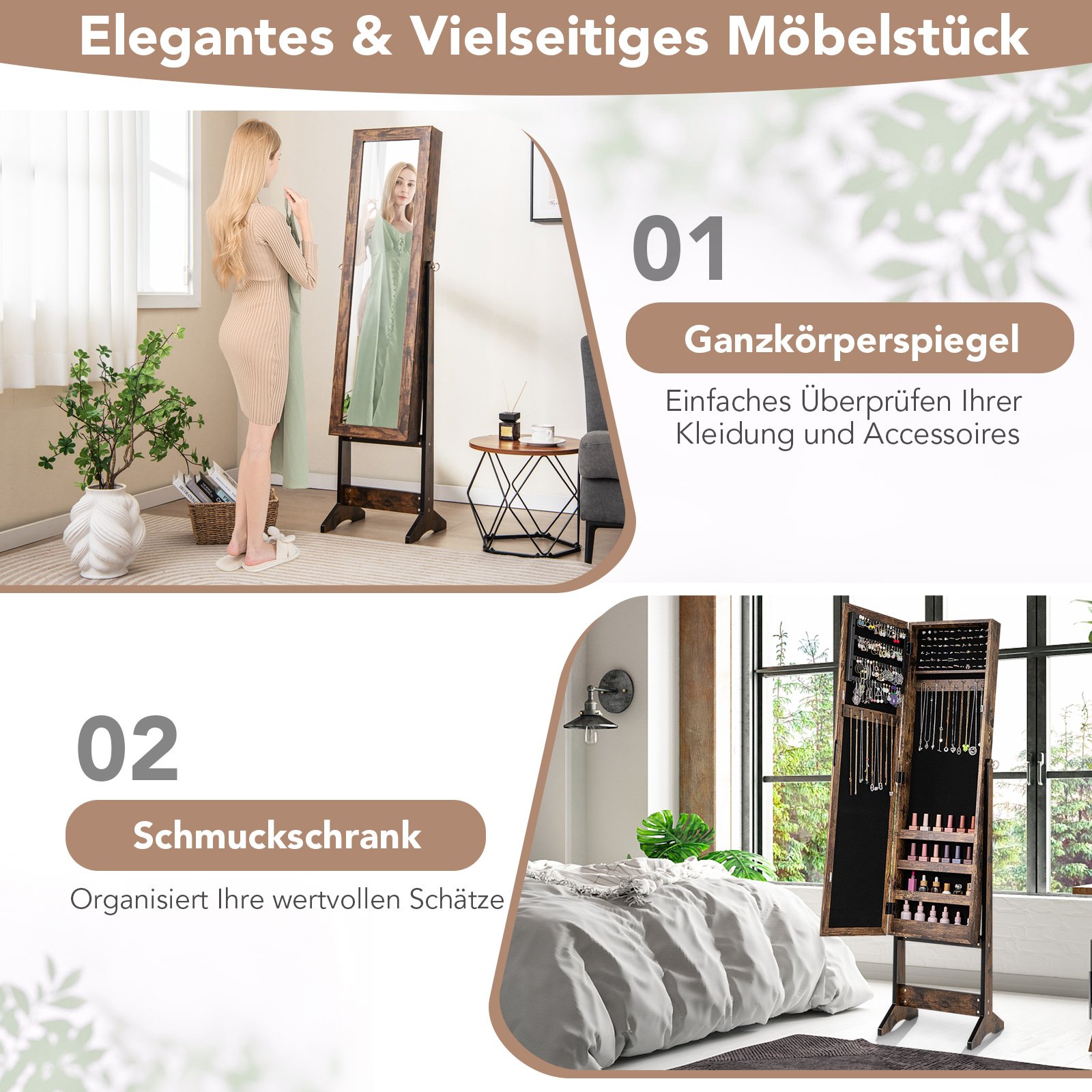 Papuošalų spintelė su viso ūgio veidrodžiu ir reguliuojamu pasvirimo kampu (Rusvos medienos)