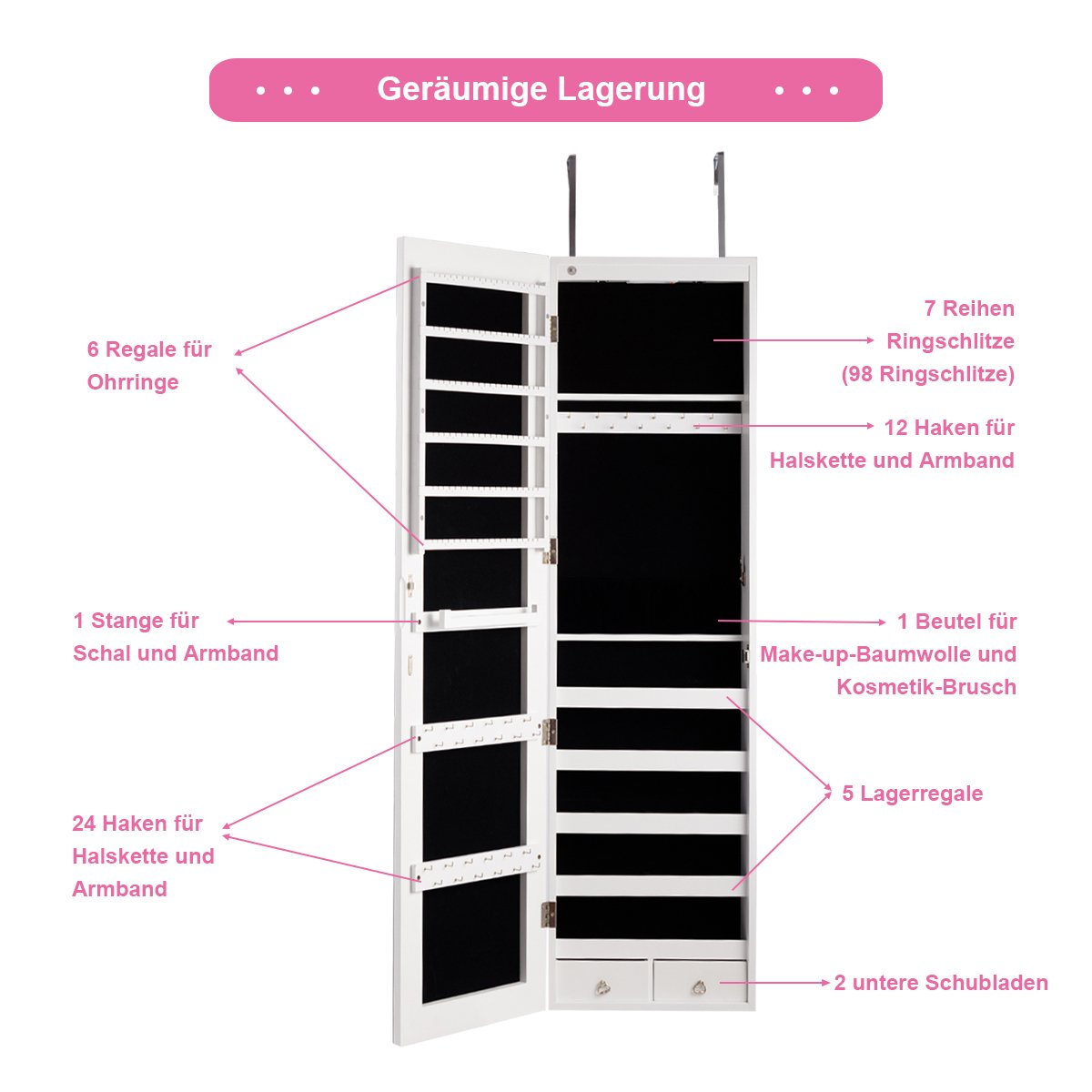 Šioje praktiškoje papuošalų spintelėje Jūsų brangenybės bus saugiai ir tvarkingai sudėtos. Su daugybe kabliukų ir skyrelių, ji leis patogiai sutalpinti žiedus, karolius, laikrodžius, apyrankes ir kitus aksesuarus. Vidus išklotas minkštu juodu aksomu, apsaugančiu papuošalus nuo subraižymų, o integruotas veidrodis leis Jums iškart pasimatuoti tinkamiausius derinius.