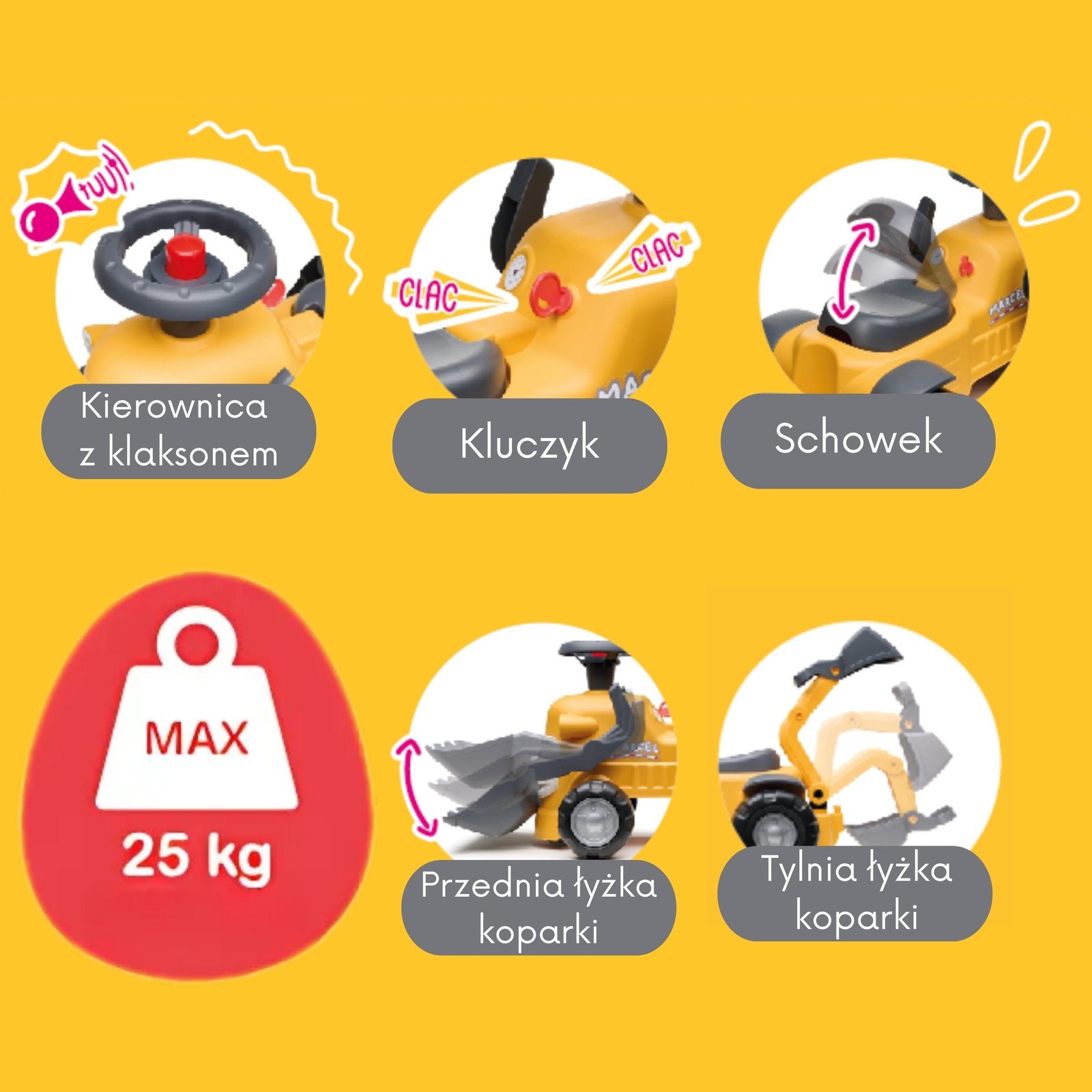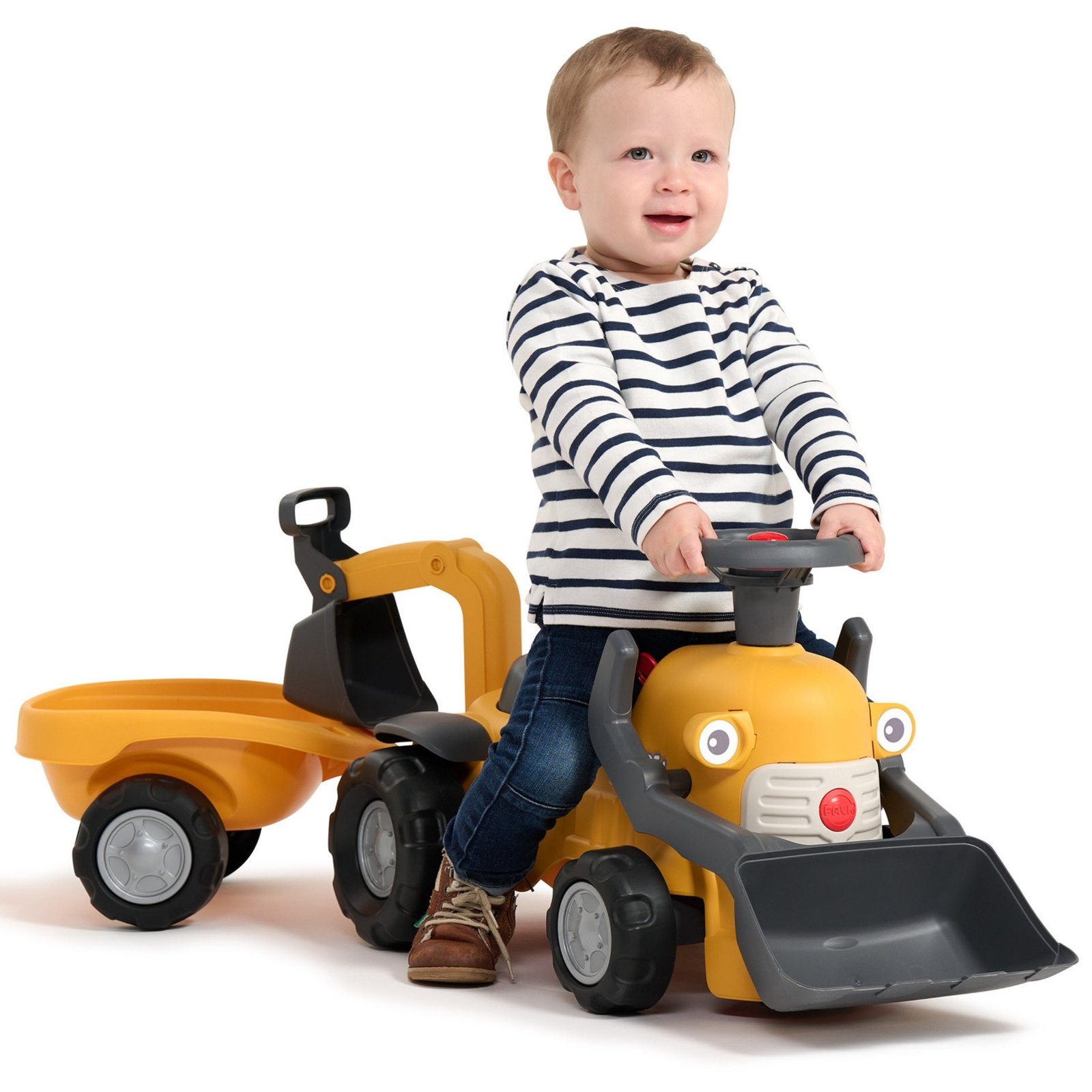 Kompaktiškas FALK paspiriamas ekskavatorius „Marcel“ su veikiančiu priekiniu kaušu, vairu su garso signalu, galiniu ekskavatoriaus kaušu ir nuimama priekaba – puikus pasirinkimas smagiems žaidimams namuose ir lauke vaikams nuo 1 metų.