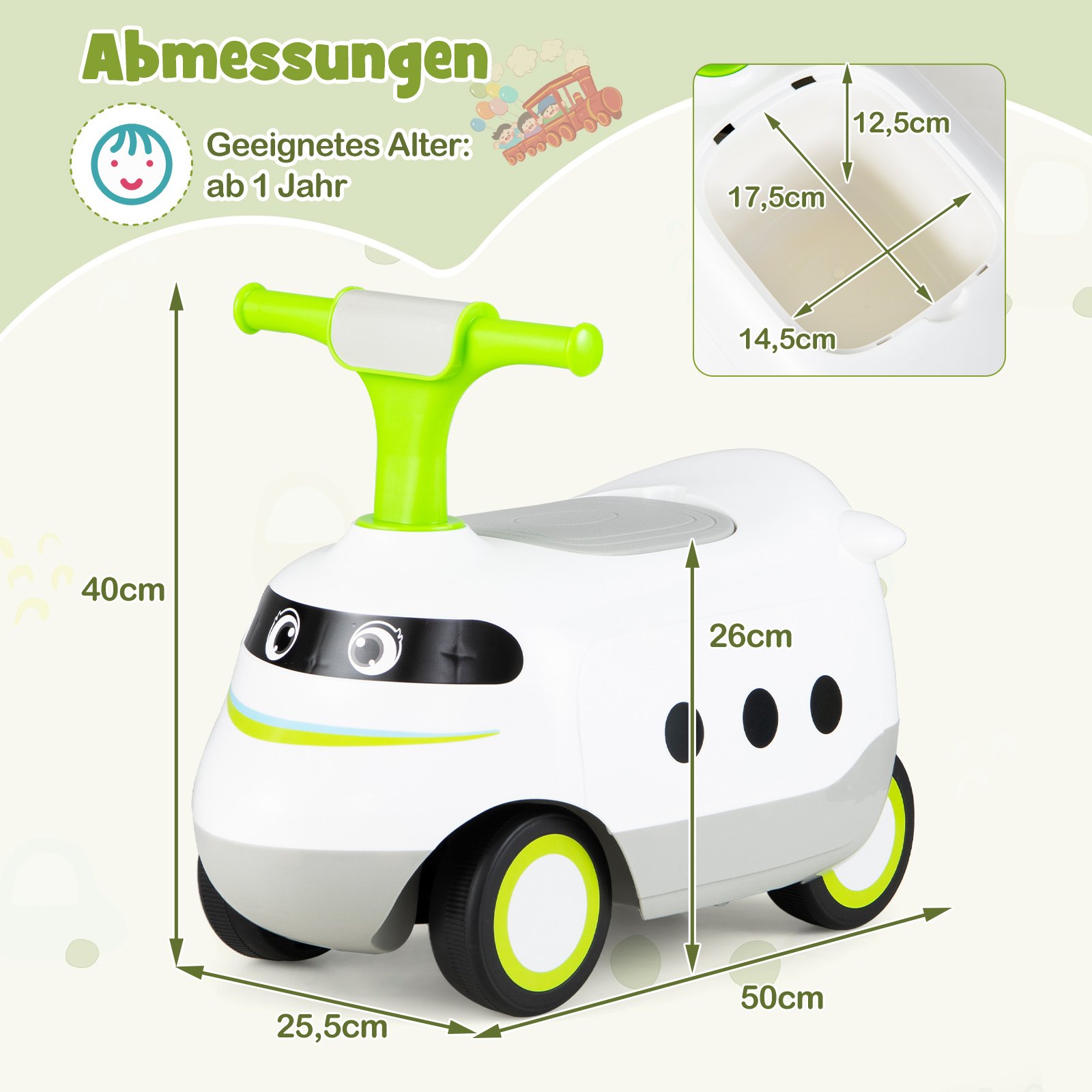 Paspiriamas vaikiškas automobilis su daiktadėže ir garso signalu (Žalia)