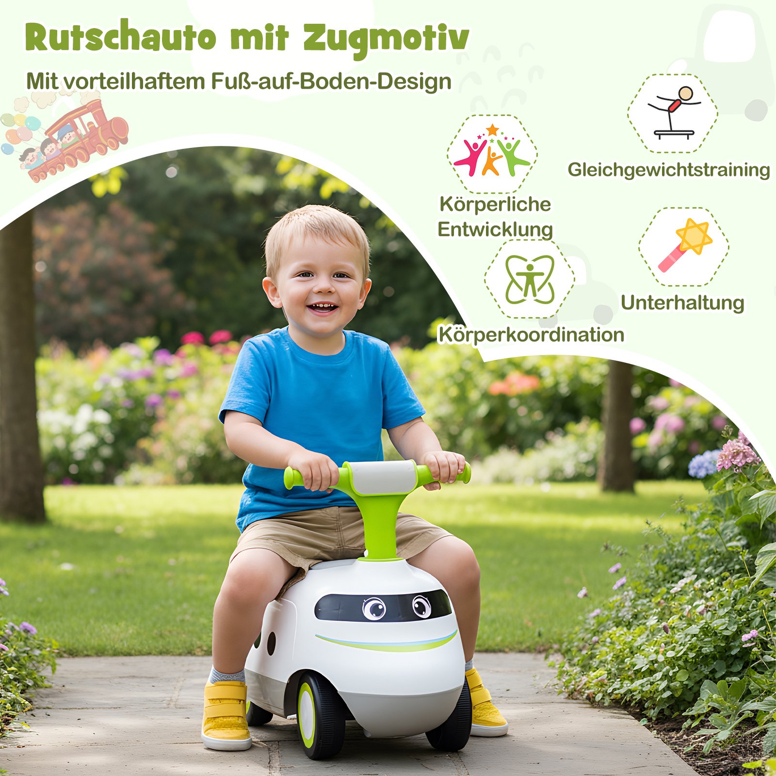 Šis interaktyvus paspiriamas automobilis skirtas 19–36 mėnesių amžiaus mažyliams. Jame įmontuotas mygtukas, aktyvuojantis traukinio garsus, kurie kviečia pasinerti į nuotykių kupiną žaidimą. Po sėdyne įrengta patogi daiktadėžė leis patogiai saugoti mėgstamus žaislus ir užkandžius pasivažinėjimo metu, o tvirti ratukai užtikrins sklandų ir stabilų važiavimą įvairiais paviršiais.