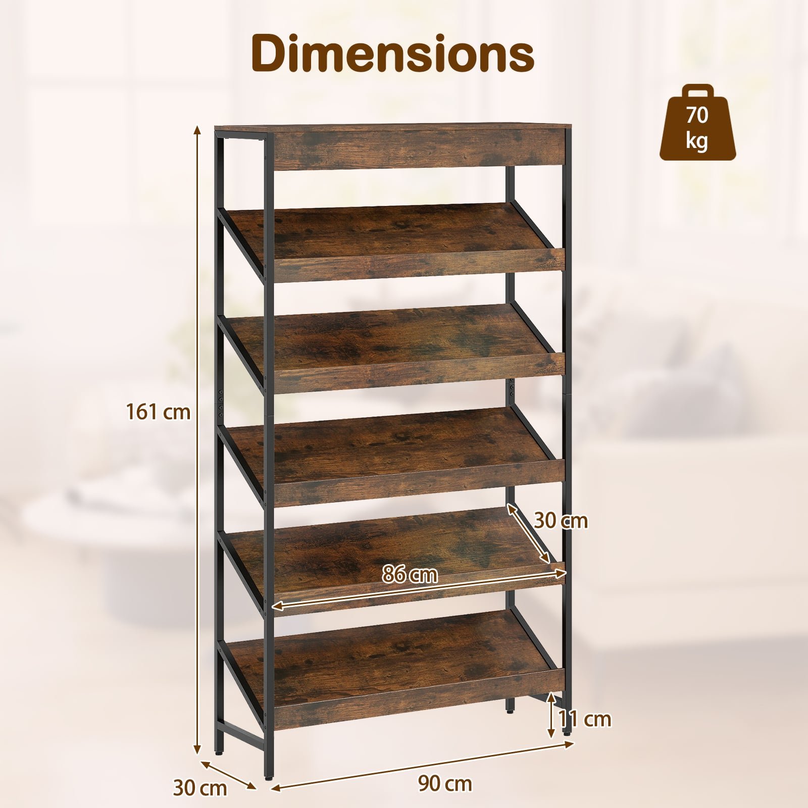 Išnaudokite savo erdvę maksimaliai efektyviai ir stilingai su mūsų 6 aukštų knygų lentyna. Ši pramoninio stiliaus lentyna pasižymi dideliu viršutiniu skyriumi ir 5 unikaliomis pasvirusiomis L formos lentynomis, puikiai tinkančiomis jūsų mėgstamiems daiktams estetiškai eksponuoti ir tvarkingai laikyti. Tvirtas metalinis rėmas ir reguliuojamos kojelės užtikrina išskirtinį stabilumą ir saugiai atlaiko didelę apkrovą.