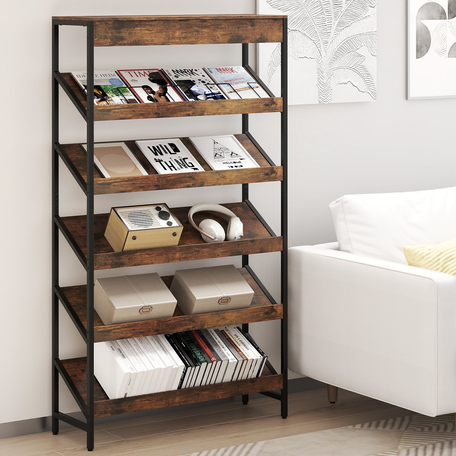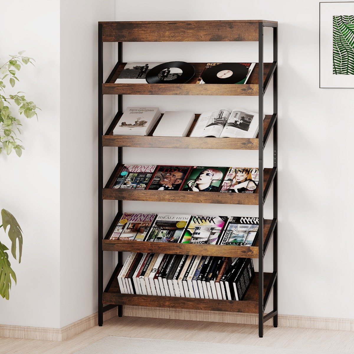 Pastatoma 6 aukštų knygų lentyna su metaliniu rėmu (Kaimiška ruda)