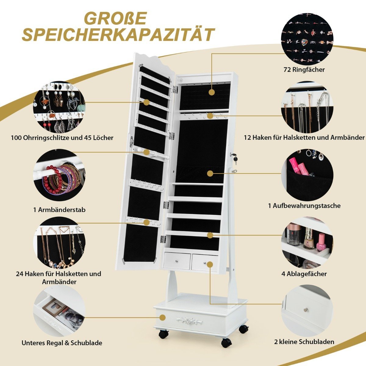 - Didelė talpa įvairiems papuošalams ir kosmetikai laikyti.