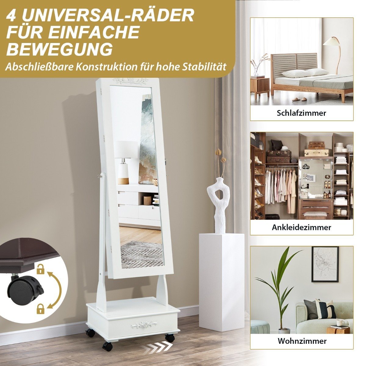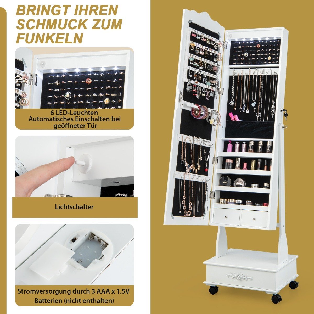 Pastatoma papuošalų spintelė su pilno dydžio veidrodžiu ir LED apšvietimu (Balta)
