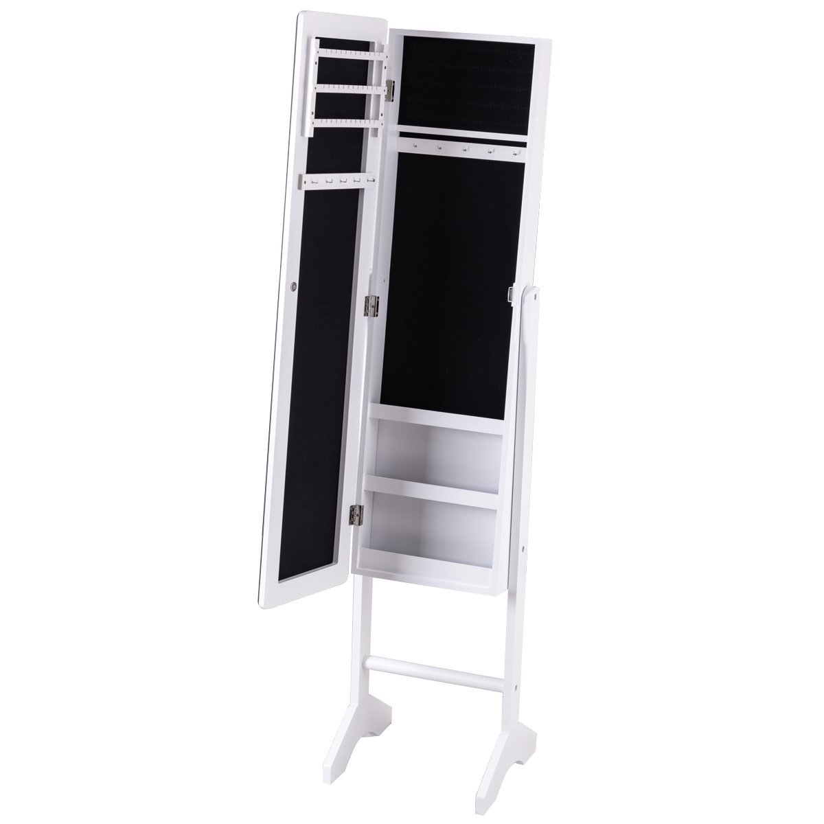Ši pastatoma papuošalų spintelė su veidrodžiu yra elegantiškas ir praktiškas sprendimas Jūsų brangenybėms laikyti. Derindama patogią papuošalų saugyklą su dideliu veidrodžiu, ji padės palaikyti tvarką ir lengvai išsirinkti tobulus aksesuarus Jūsų aprangai. Vidus, išklotas minkštu aksomu, užtikrina maksimalią papuošalų apsaugą nuo subraižymų.