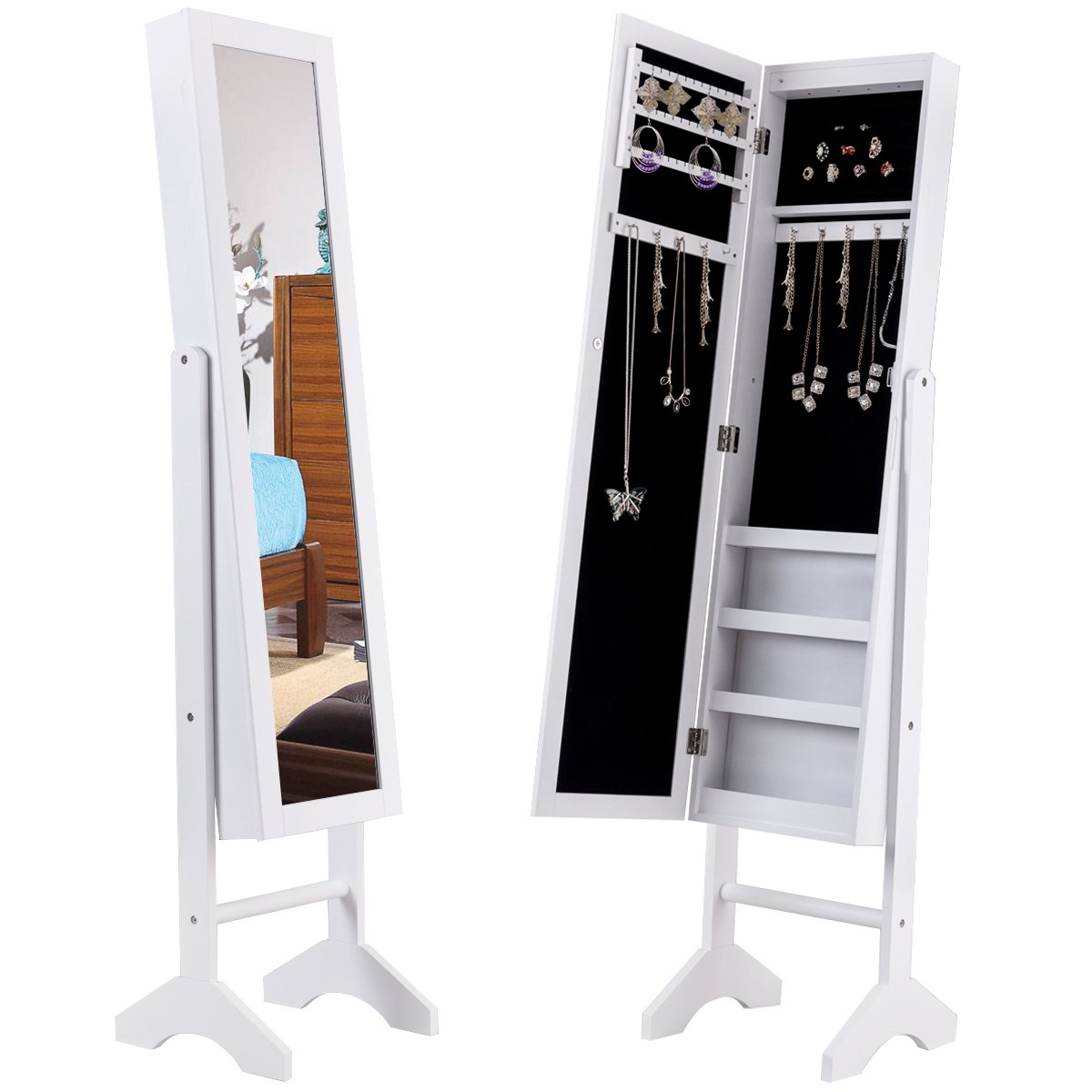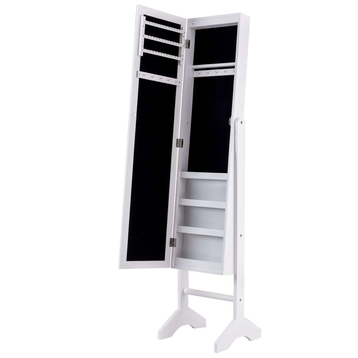 Ši praktiška papuošalų spintelė su veidrodžiu puikiai tinka Jūsų brangenybėms saugoti ir tvarkingai laikyti. Dėl gausybės kabliukų, laikiklių ir skyrių, joje patogiai sutalpinsite įvairius žiedus, karolius, laikrodžius ir apyrankes. Didelis veidrodis leis iš karto pasimatuoti ir priderinti papuošalus prie Jūsų aprangos.