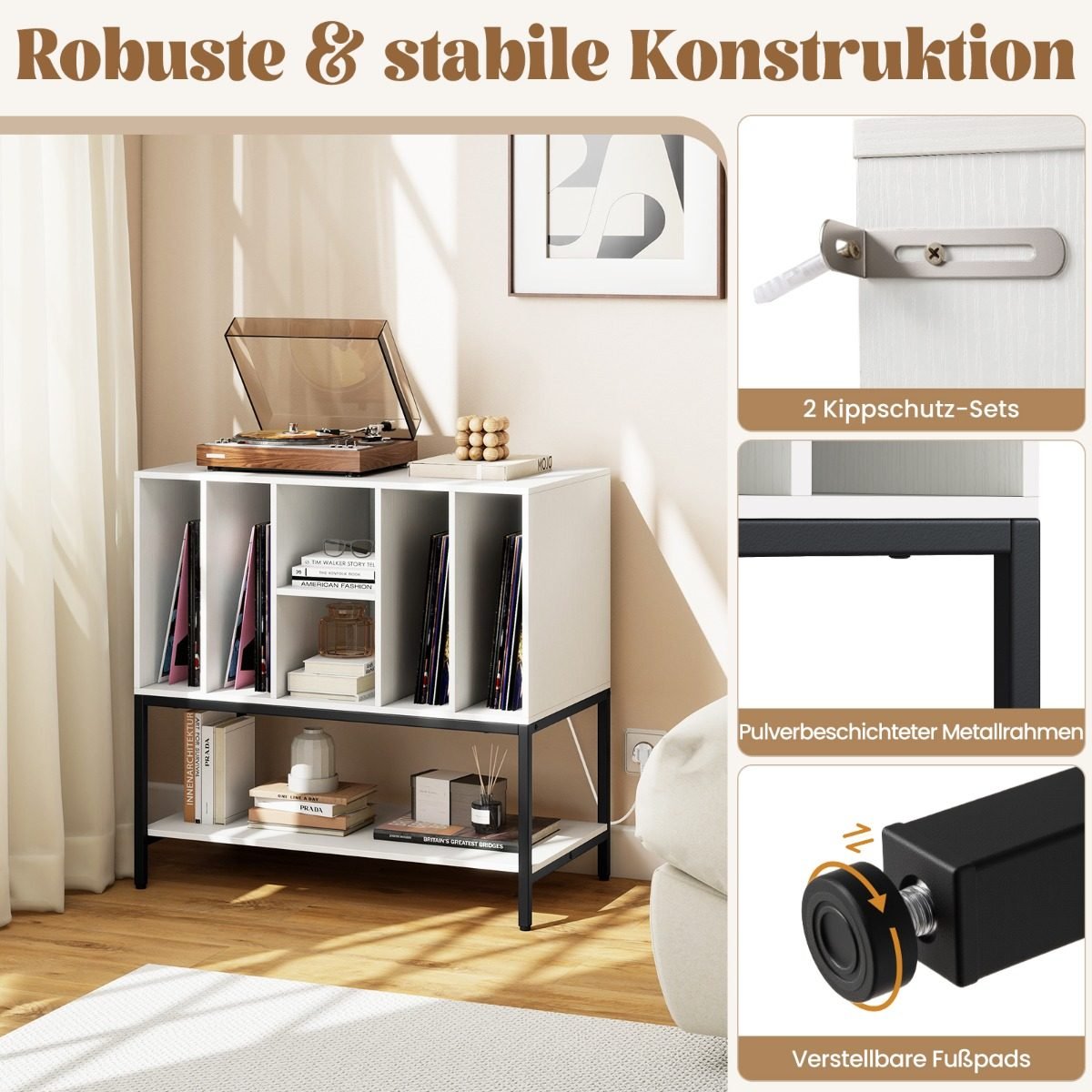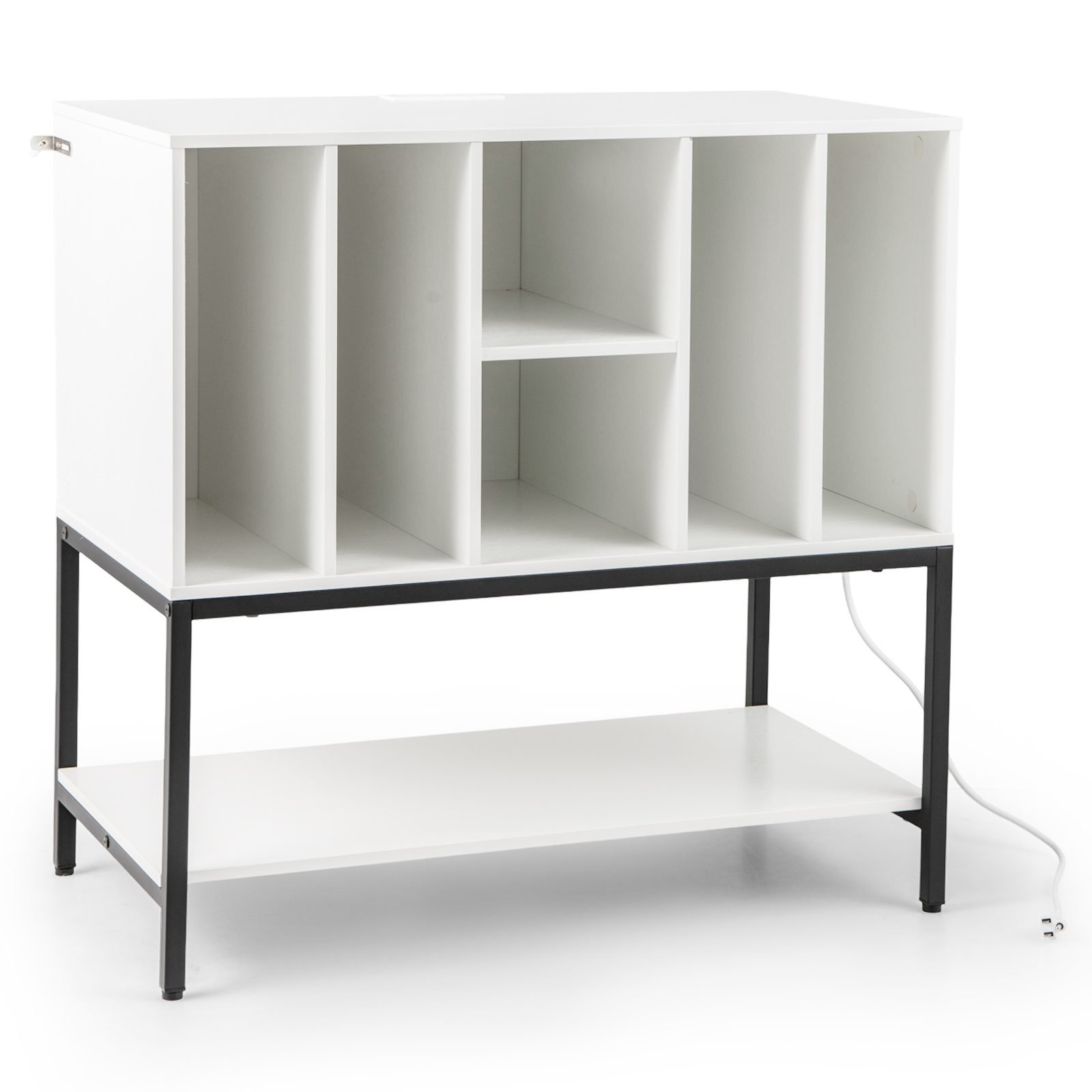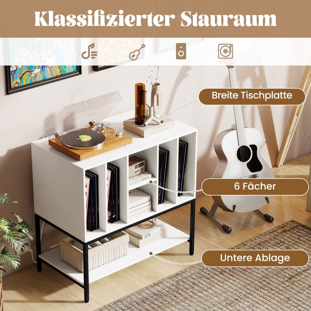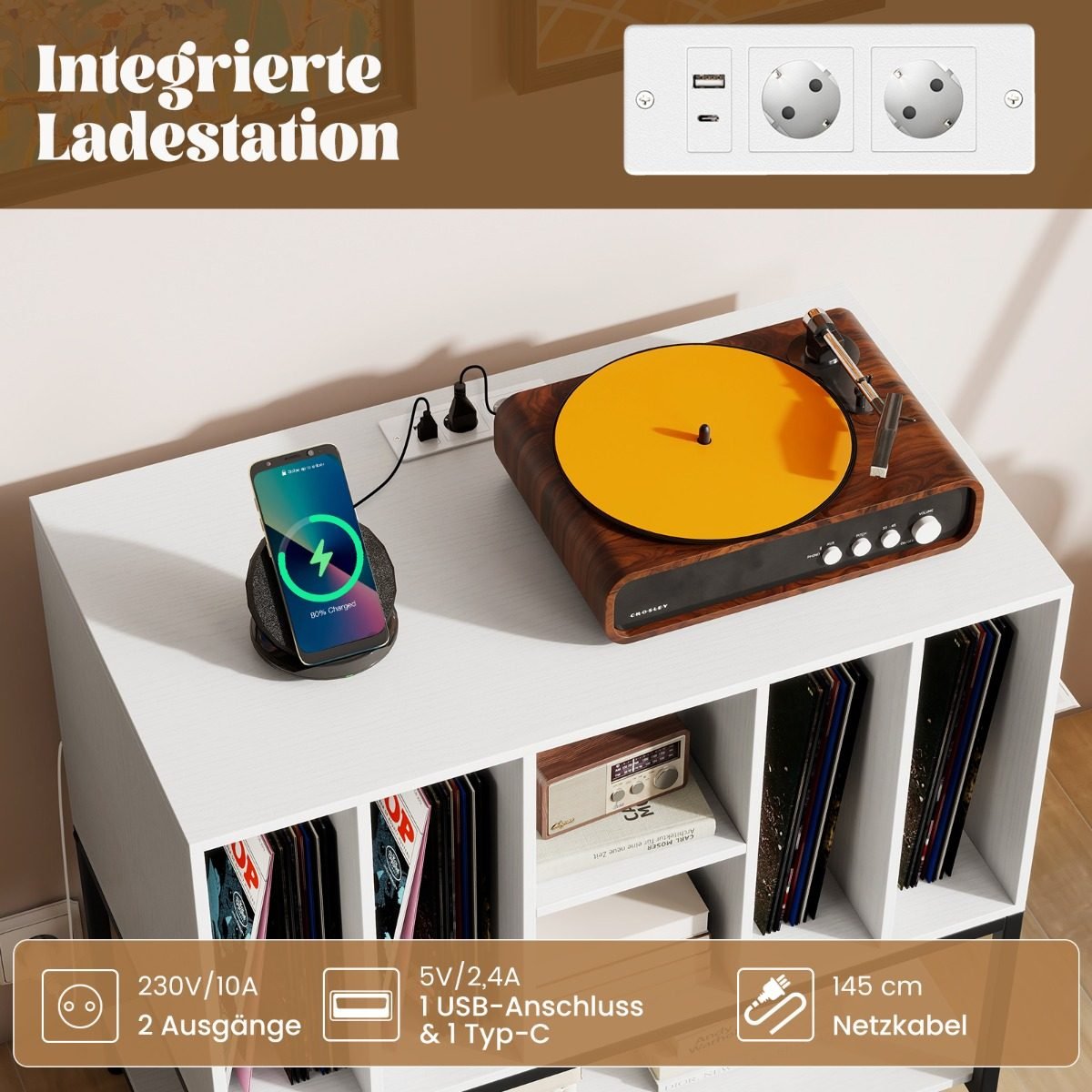 Pastatomas patefono stovas su integruota įkrovimo stotele ir vietos plokštelių laikymui (Balta)