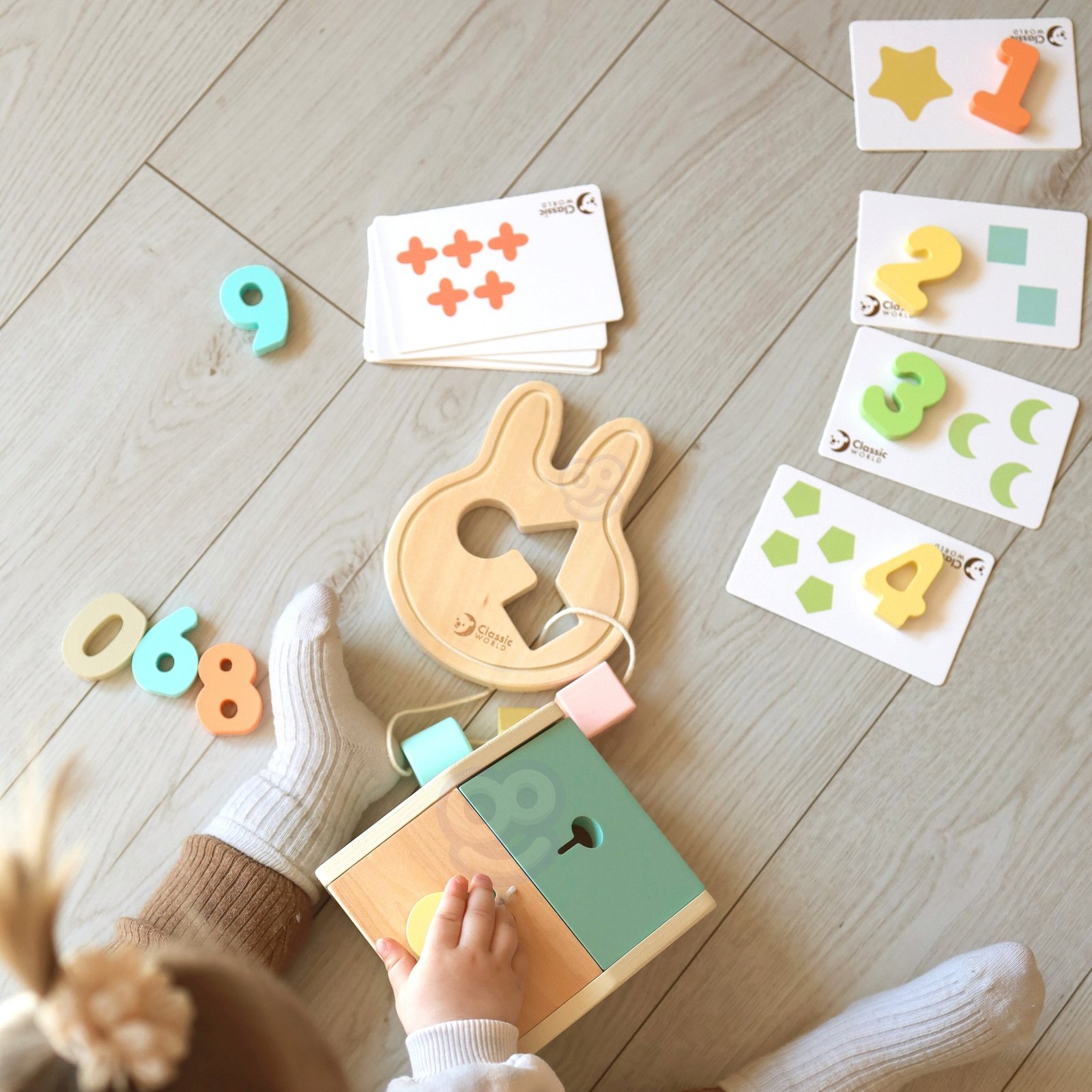 Šis pastelinių spalvų „Classic World“ mokomasis rinkinys sukurtas skatinti natūralų vaiko smalsumą ir siūlo įvairias, įtraukiančias veiklas. Jį sudaro formų rūšiuoklis, dėlionė skaičiavimo mokymuisi, kaladėlės ir kiškio formos vėrimo žaislas. Tai visapusis rinkinys, padedantis vienoje dėžutėje lavinti motorinius įgūdžius, regimąjį pažinimą ir skatinantis bendrą vaiko vystymąsi.
