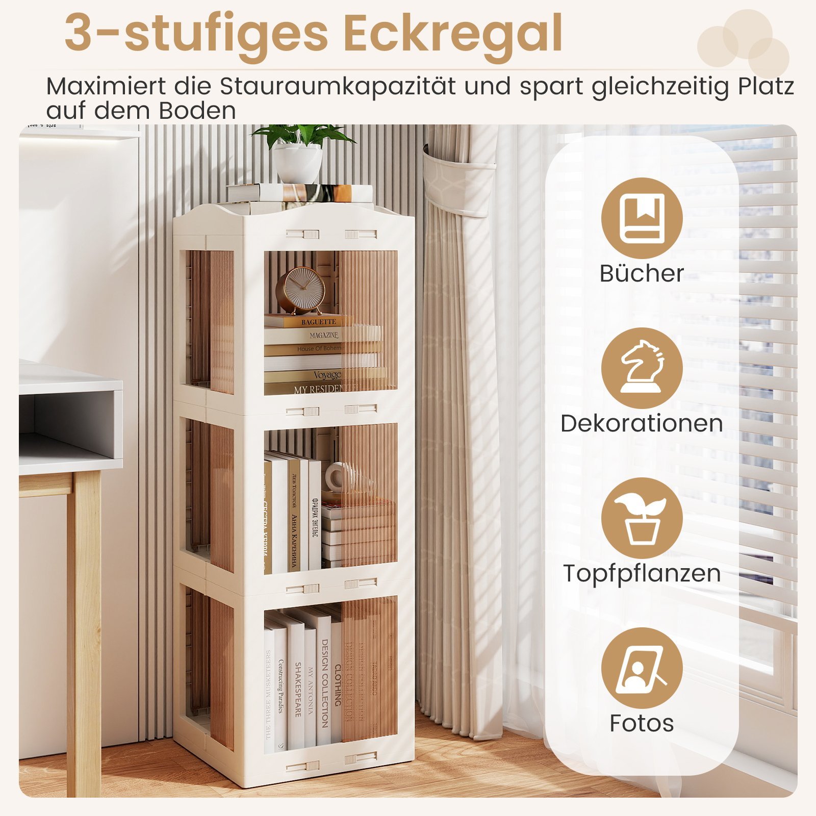 - Trys aukštai užtikrina daug vietos knygoms, dekoracijoms ir augalams.