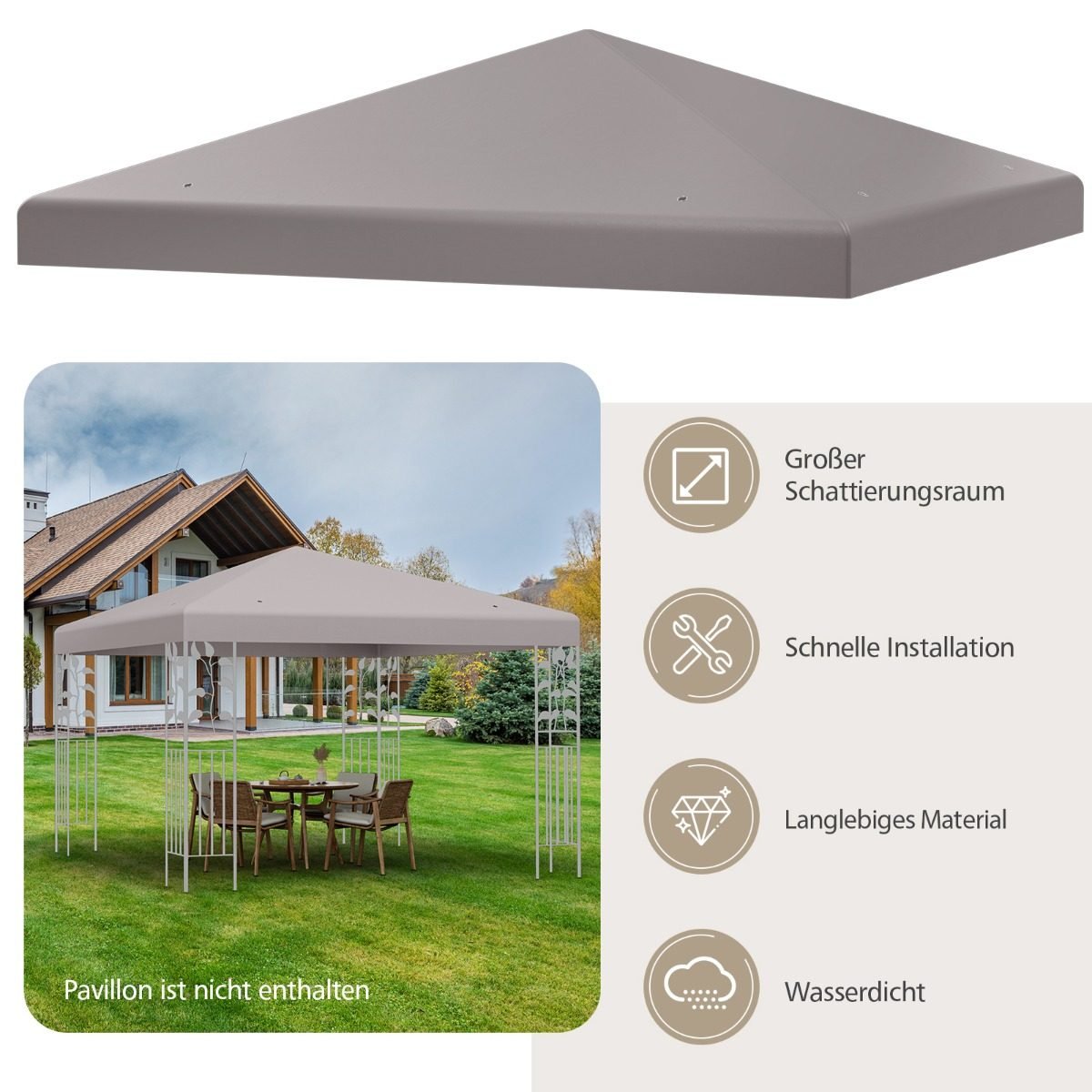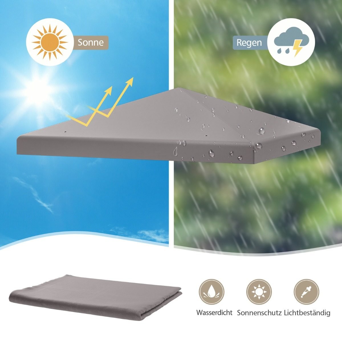 Užtikrinkite komfortišką poilsį lauke su aukštos kokybės paviljono stogo uždangalu, sukurtu atlaikyti įvairias oro sąlygas. Šis 300×300 cm dydžio uždangalas – puikus sprendimas tiems, kurie nori atnaujinti savo sodo paviljoną ir mėgautis komfortu tiek saulėtu, tiek lengvai lyjant.