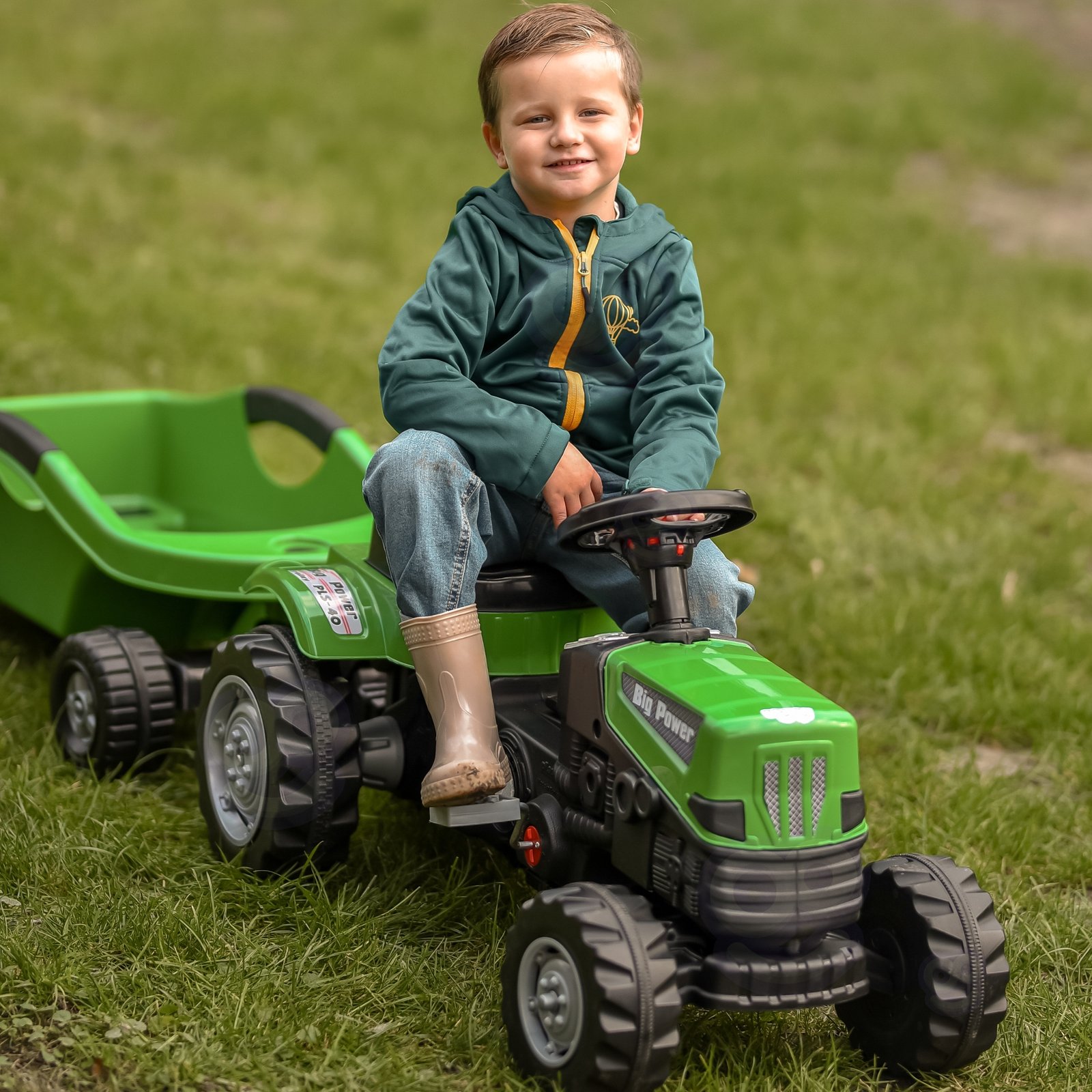 • Didelė ir tvirta priekaba – puikiai tinka žaislams, sodo įrankiams ar kitiems vaikiškiems „kroviniams“ vežti.
