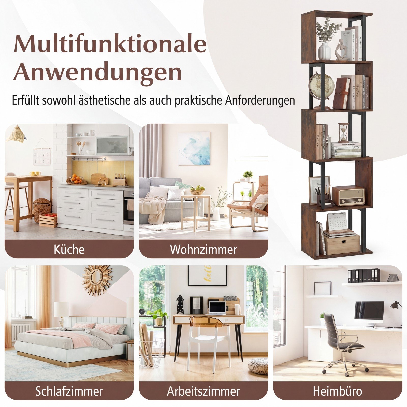 Ieškote lentynos, kuri būtų ne tik funkcionali, bet ir estetiška? Ši penkių aukštų lentyna su unikaliu geometriniu dizainu puikiai derės bet kurioje patalpoje, suteikdama daug vietos daiktams, o jūsų interjerui – modernumo ir stiliaus. Ji puikiai tinka žurnalams, vazoniniams augalams, nuotraukų rėmeliams ir kitiems dekoratyviniams elementams eksponuoti, užtikrinant patogią prieigą ir nepriekaištingą tvarką.