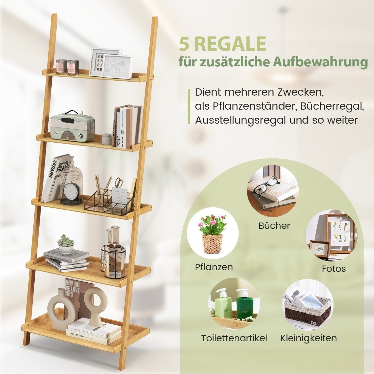 Sutelpa viską tvarkingai su mūsų 5 pakopų kopėčių tipo lentynomis! Pagamintos iš tvirto, natūralaus bambuko rėmo, šios lentynos pasižymi aukštu patvarumu, atsparumu įtrūkimams ir yra saugios ilgalaikiam naudojimui. Su 5 lentynomis ir paaukštintais kraštais, jos suteikia pakankamai vietos daiktams laikyti ir apsaugo juos nuo nukritimo.