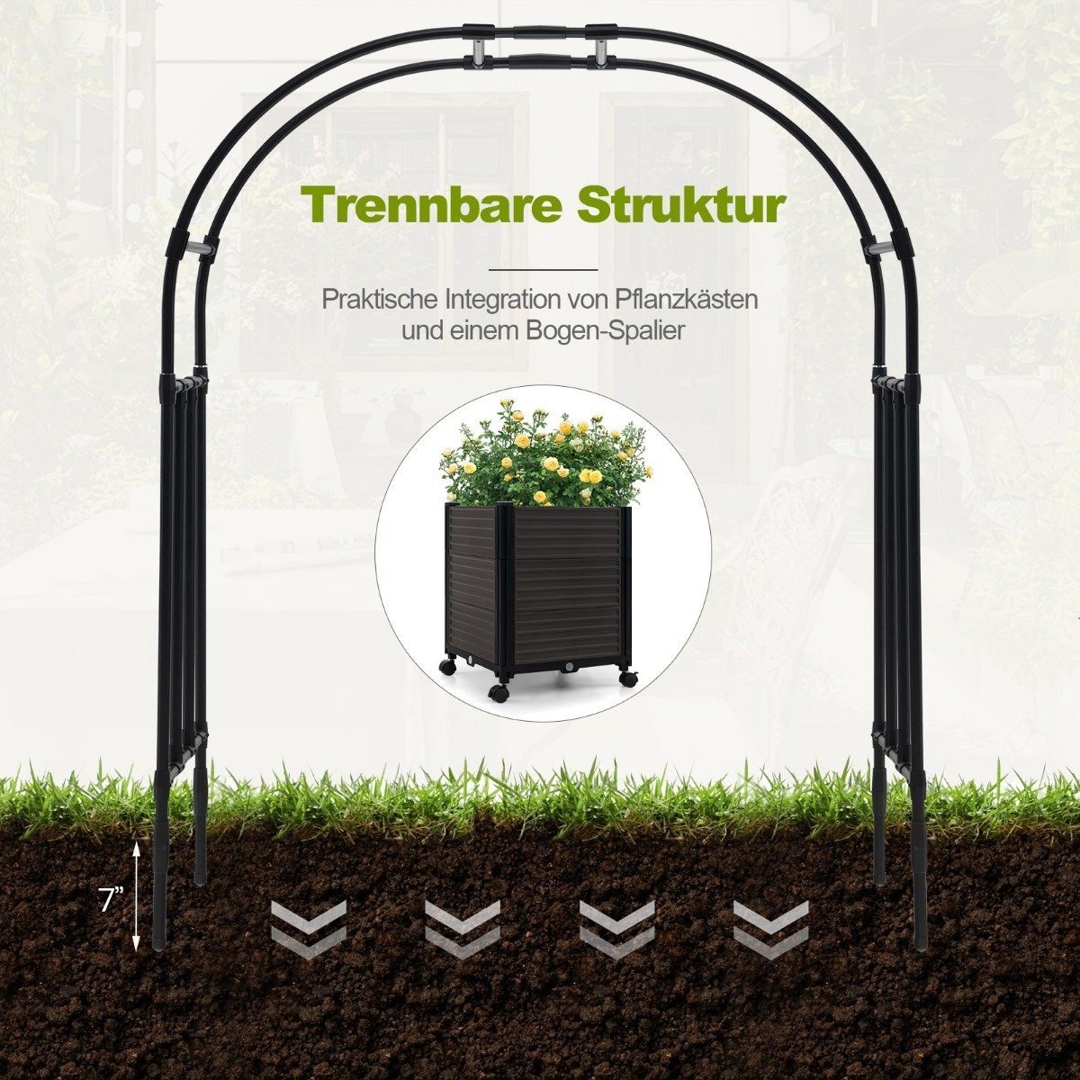 Paverskite savo sodą ar terasą stilinga ir funkcionalia oaze su šia universalia pergola. Ji ne tik suteiks atramą jūsų mėgstamiems vijokliniams augalams, bet ir leis juos patogiai auginti integruotose lysvelėse. Idealiai tinka rožėms, vynmedžiams, agurkams ir kitiems laipiojantiems augalams.