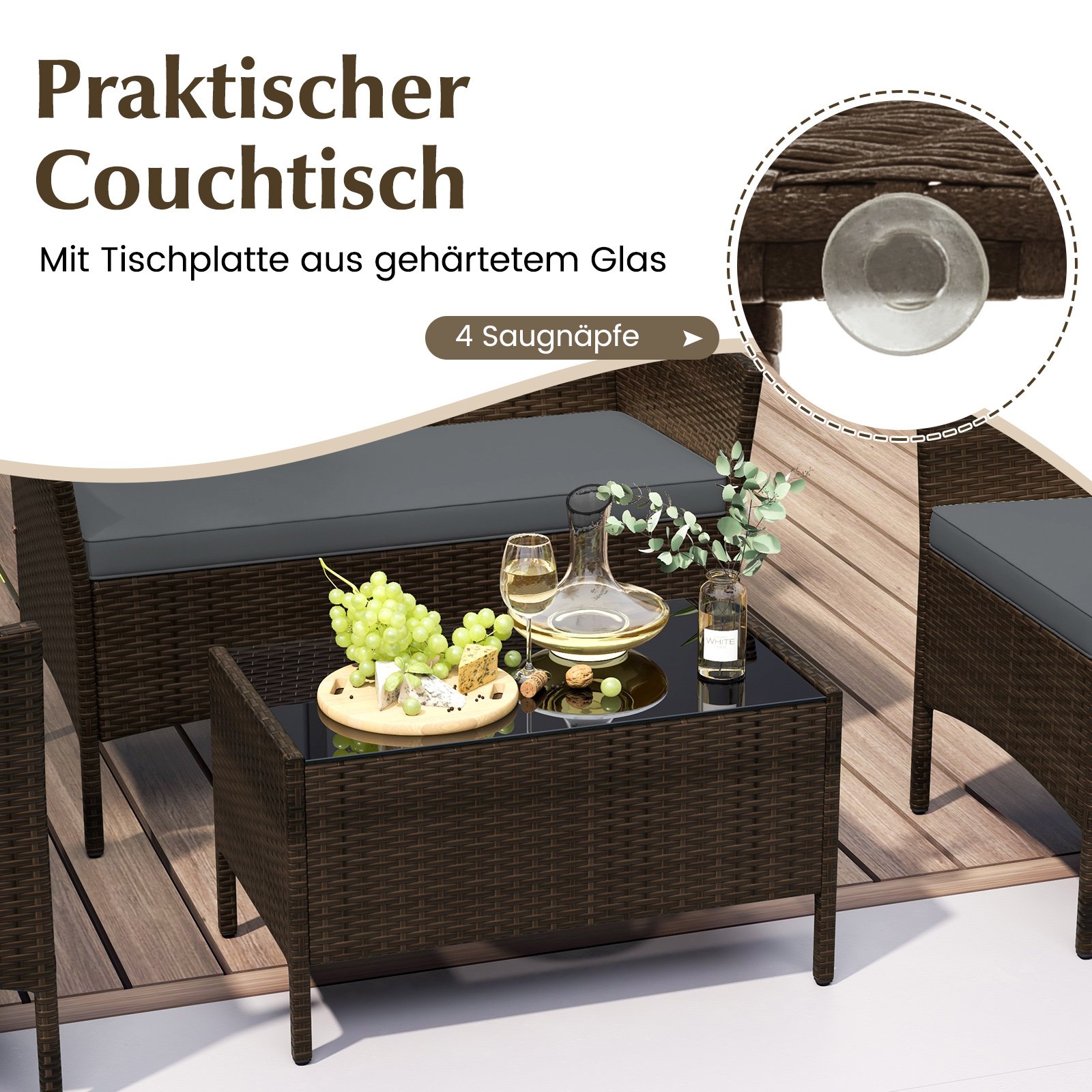 - Aukštos kokybės PE ratanas: Elegantiškas, atsparus saulės poveikiui ir blukimui, užtikrinantis ilgaamžiškumą.