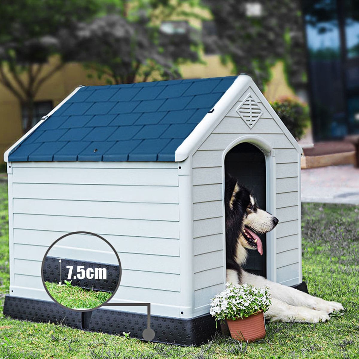 Plastikinė šunų būda paaukštintu dugnu (Mėlyna ir balta)