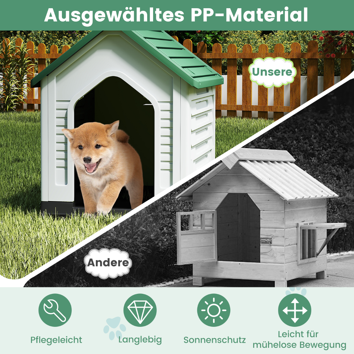 Suteikite savo augintiniui jaukų ir saugų poilsio kampelį. Ši aukštos kokybės PP medžiagos šunų būda yra tvirta ir ilgaamžė, užtikrinanti puikią apsaugą nuo įvairių oro sąlygų.