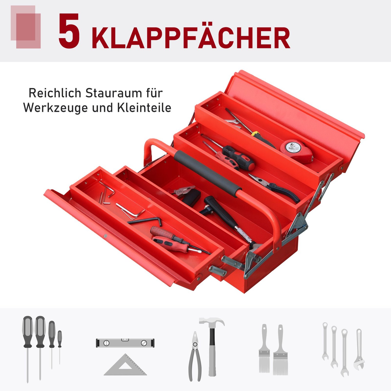 Plieninė įrankių dėžė su penkiais išskleidžiamais skyriais