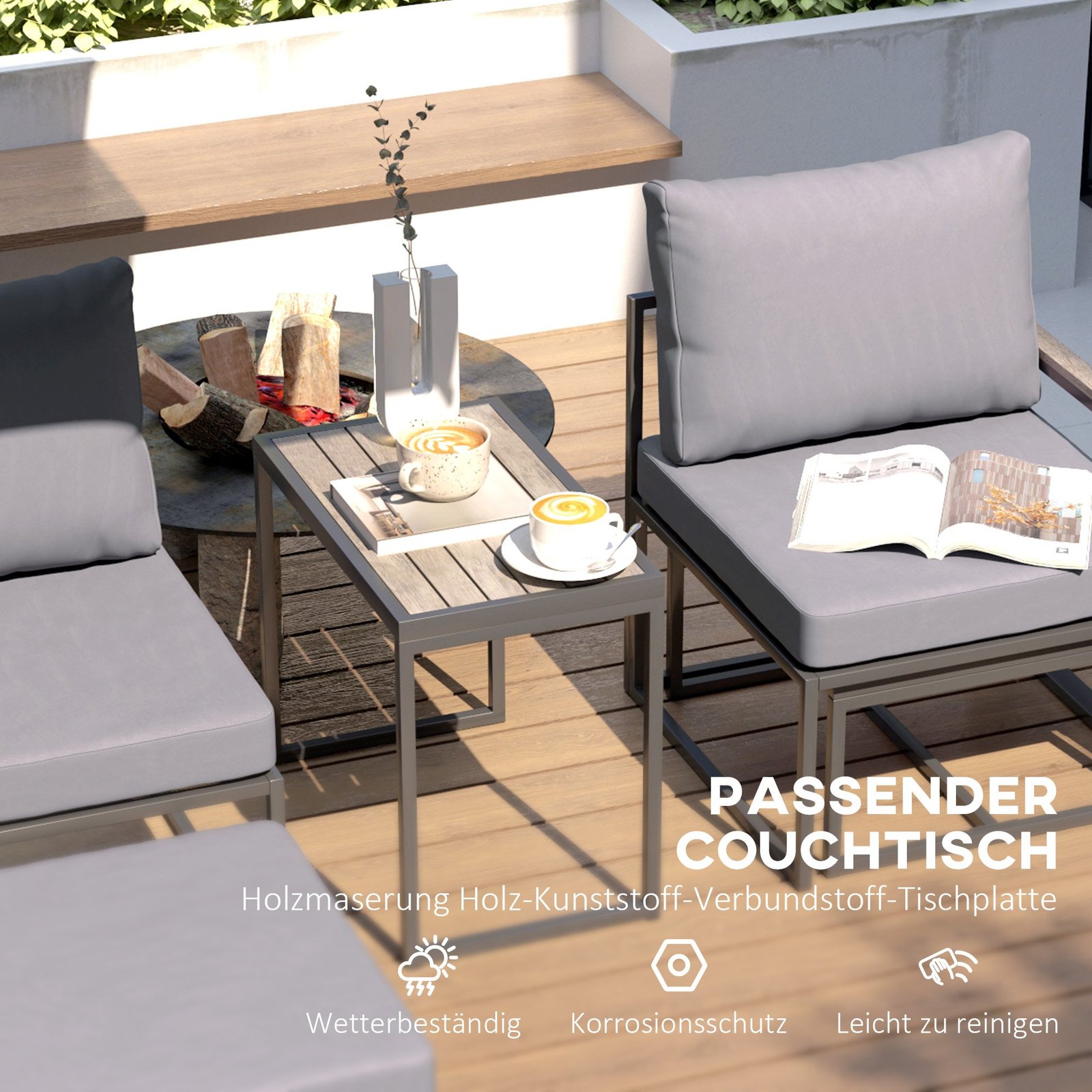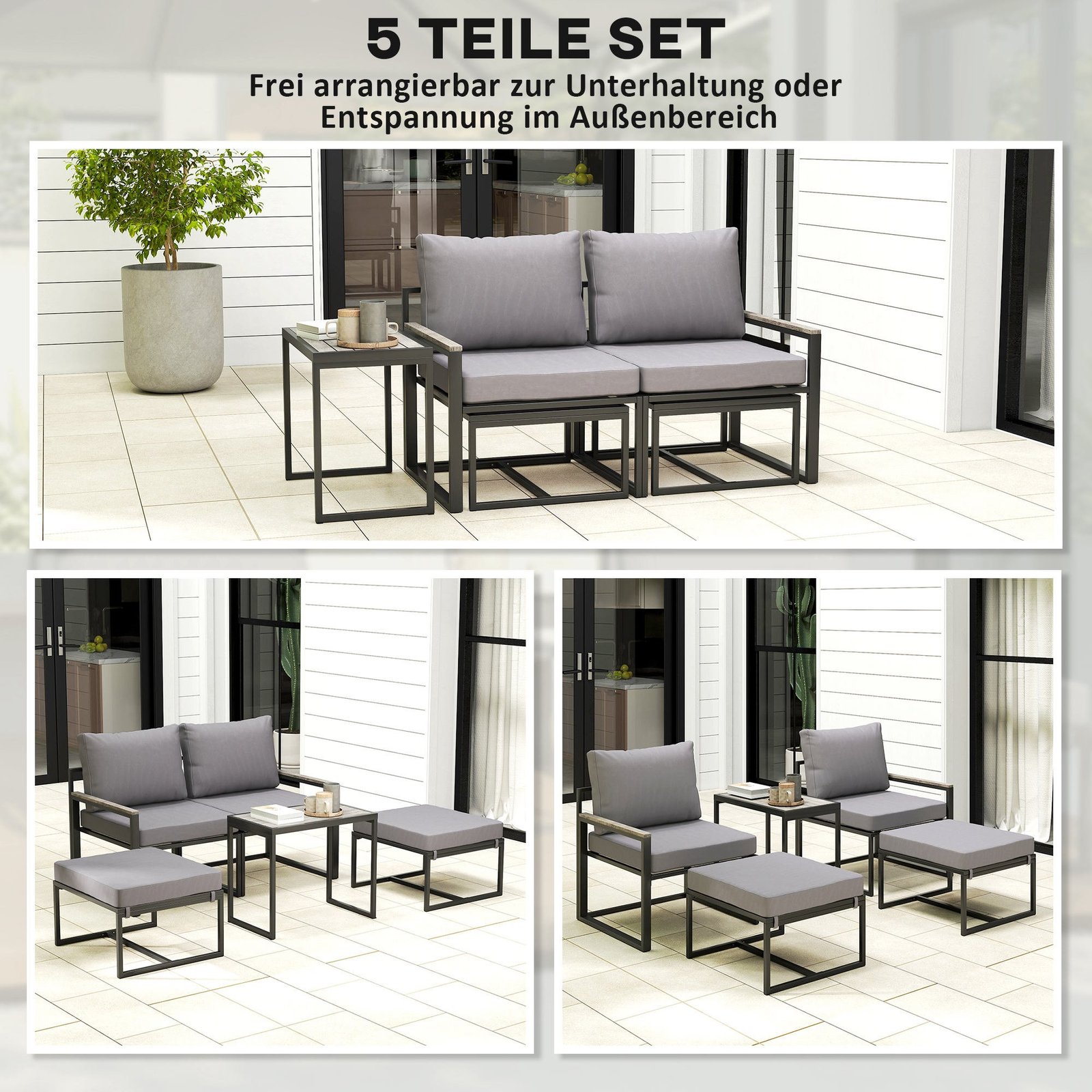 ✔ Penkių dalių komplektas: apima du krėslus, du pufus ir atitinkantį kavos staliuką