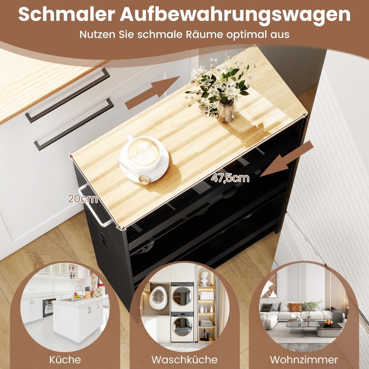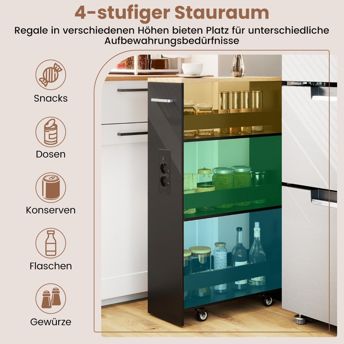 Šis itin plonas, mobilus daiktų laikymo vežimėlis puikiai tinka siauroms erdvėms ir siūlo revoliucinį sprendimą namų tvarkai palaikyti. Jo sumanus keturių aukštų dizainas suteikia daug vietos įvairiems daiktams, nuo virtuvės prieskonių iki skalbimo reikmenų. Pamirškite išsikrovusius įrenginius ir kabelių netvarką – vežimėlis turi integruotą šoninę įkrovimo stotelę su kintamosios srovės (AC), USB ir C tipo jungtimis. Lengvai perkelkite vežimėlį naudodami patogią rankeną ir sklandžiai riedančius ratukus.